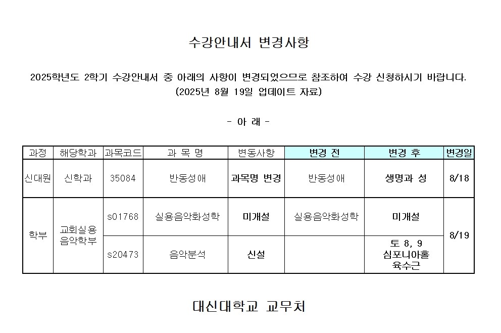 2025학년도 2학기 수강안내서 변경사항 안내(8/19)
