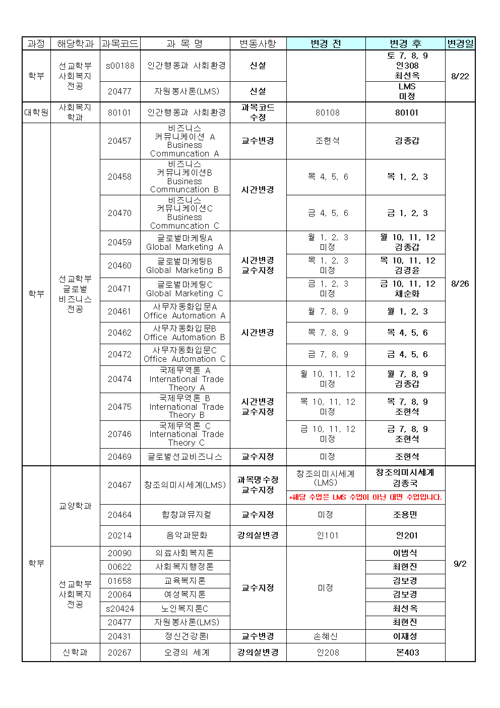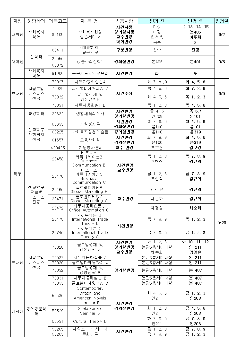 2025학년도 2학기 수강안내서 변경사항 안내(9/29)