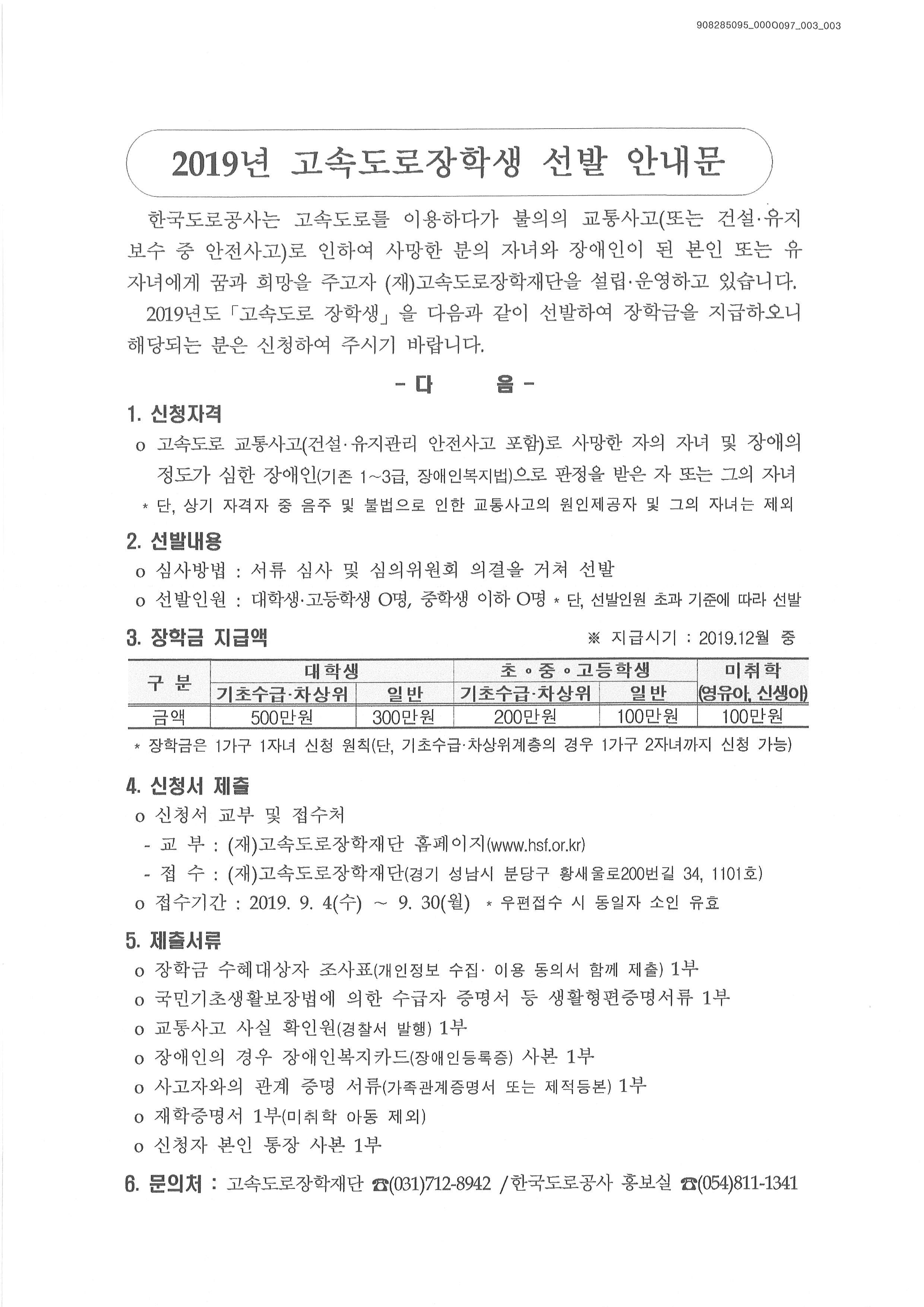 [고속도로장학재단] 2019년 고속도로 장학생 선발 안내