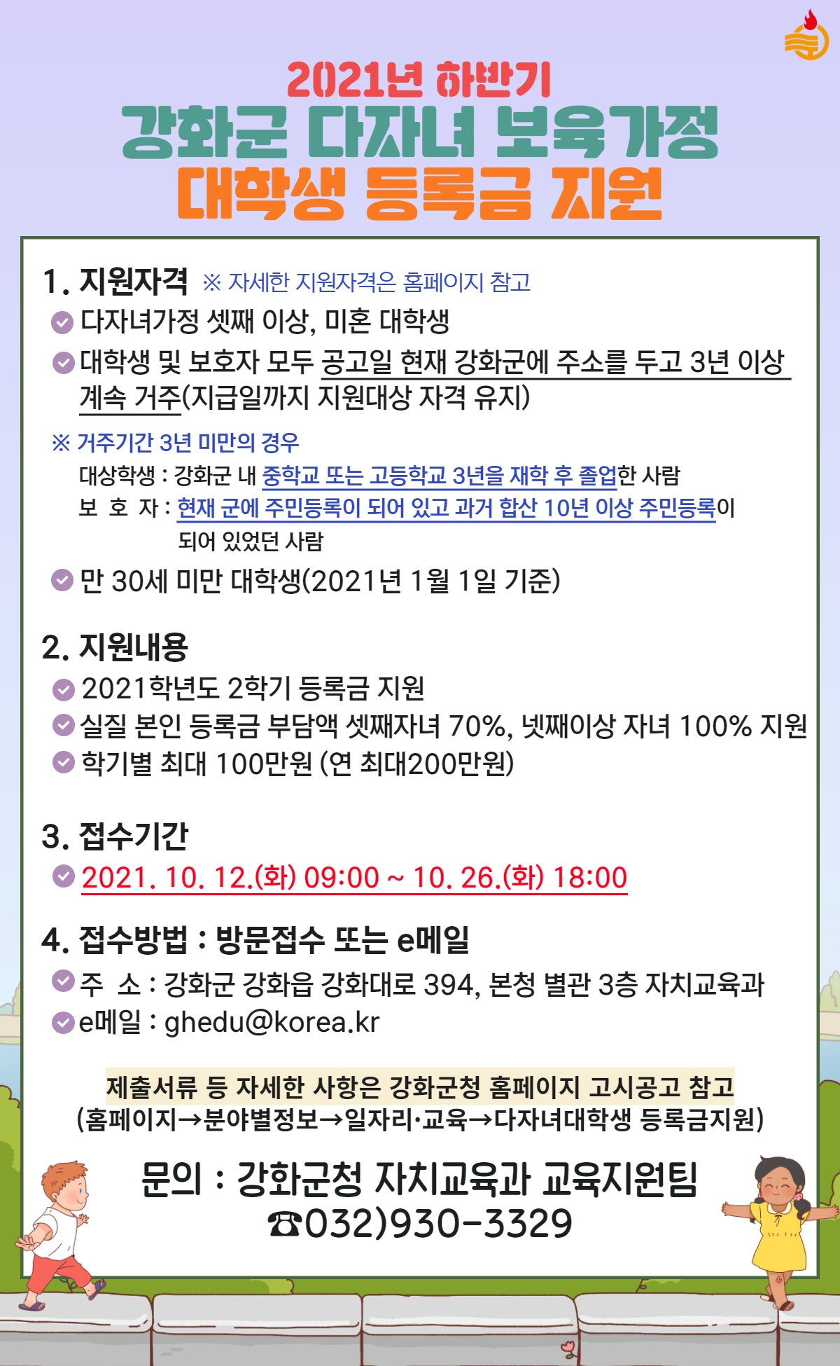 1. 지원내용 : 2021학년도 2학기 등록금 지원 2. 접수기간: 2021.10.12.(화) 09:00 ~ 10.26.(화) 18:00 3. 접수방법: 방문접수 또는 e메일 - 주소: 강화군 강화읍 강화대로 394, 본청 별관 3층 자치교육과 - e메일: ghedu@korea.kr 제출서류 등 자세한 사항은 강화군청 홈페이지 고시공고 참고 4. 문의: 강화군청 자치교육과 교육지원팀 032-930-3329
