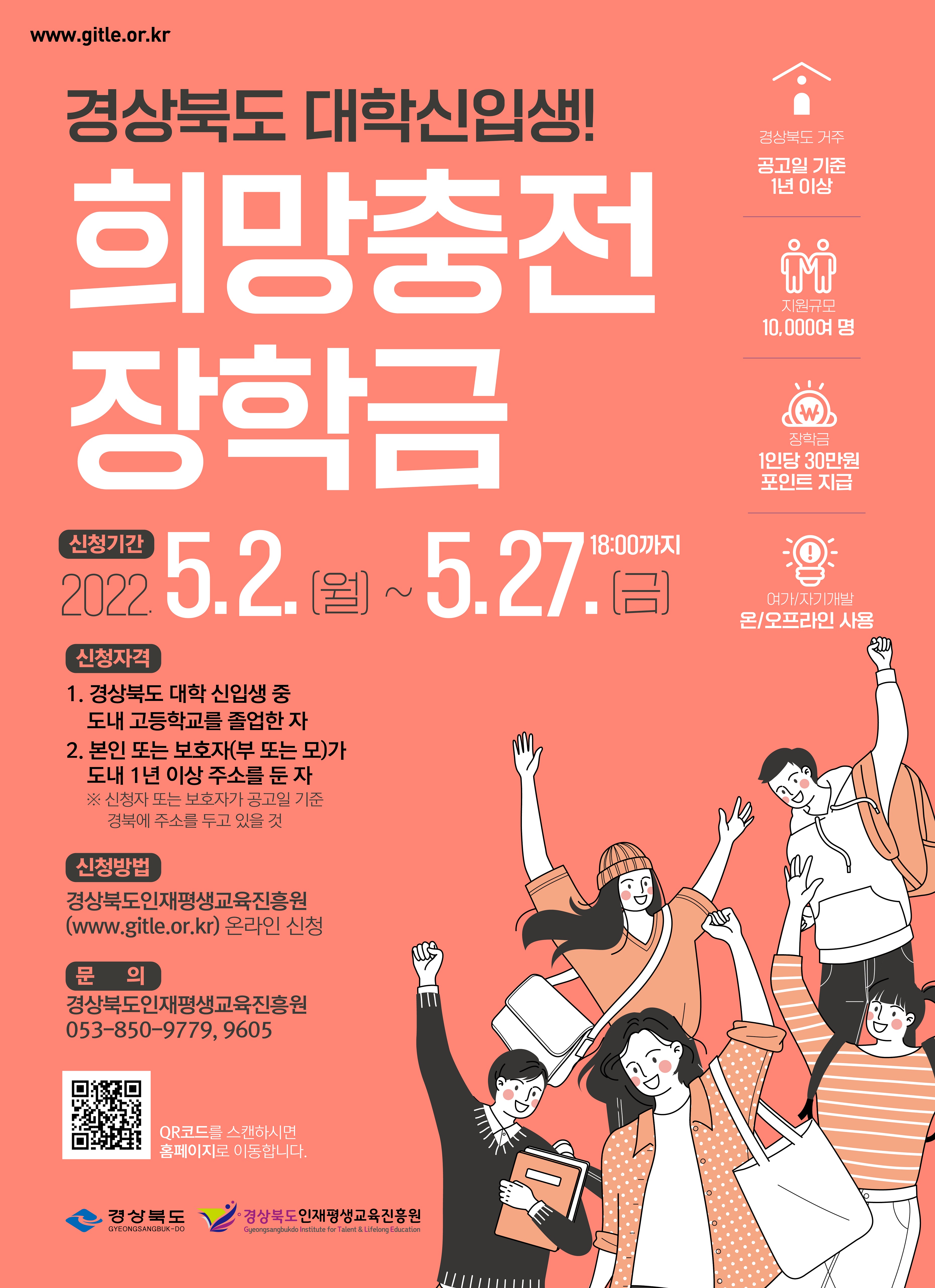 □ 기간 : 2022. 5월02일 ~ 5월 27일까지 □ 자격요건 ? (대상) 도내 소재 대학신입생(4년제, 전문대 등 신입생) - 도내 고등학교를 졸업 후 본인 또는 보호자(부 또는 모)가 도내 1년 이상 주소를 둔 자 ? (주소) 경상북도 내 1년 이상 거주(공고일 기준) □ 신청 ? 신청기간 : 공고일부터 4주간 신청?접수(’21. 5. 2. 예정) ? 신청방법 : 진흥원 누리집 접속 후, 희망충전 장학금 온라인 신청 ? 제출서류 - 신청서(온라인 서식) 1부 - 개인정보 수집?이용?제공 및 고유식별정보 처리에 관한 동의서 (온라인 서식) 1부 - 고등학교 졸업증명서(단, 검정고시 자는 고졸 검정고시 증명서) 1부 - 대학 입학확인서(재학증명서) 1부 - 주민등록 초본 1부(최근 2년간 주소 포함, 본인 또는 부모) ※ (추가) 가족관계증명서 1부(부모가 경북 도내 거주하며 부모와 주소가 다를 경우) |