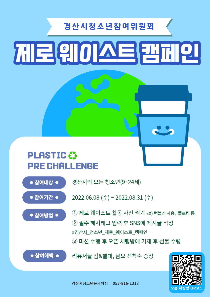 ?가. 참여대상: 경산시의 모든 청소년(만9세~만24세) 나. 참여기간: 2022.06.08 ~ 08.31 다. 참여방법 1) 제로웨이스트 활동 사진 찍기 2) 필수 해시태그 입력 후 sns에 게시글 작성 3) 미션 수행 후 오픈 채팅방에 기재 후 선물 수령 라. 참여혜택: 리유저블 컵 & 빨대, 담요 선착순 증정 마. 문의처: 경산시청소년문화의집(053-816-1318) |