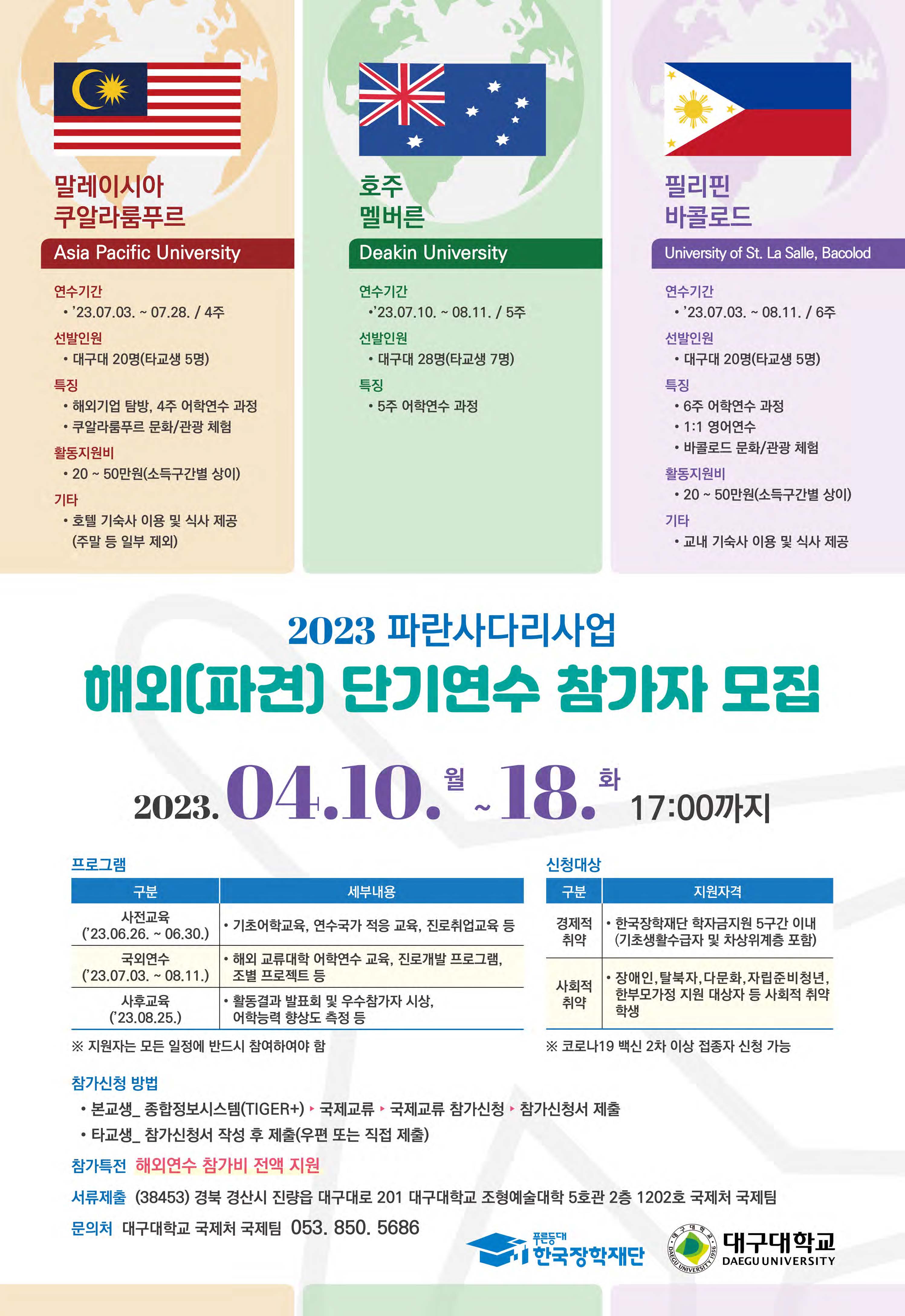 2023 파란사다리사업 해외연수 1) 내용 : 대학의 경제.사회적 취약계층 재학생들에게 글로벌 진로탐색 경험 제공을 통한 진로역량 개발 및 외국어능력 배양의 기회 제공 2) 학생 선발 : 총 85명(대구대학교 재학생 68명, 타교 재학생 17명) 3) 교육 내용 - 집중 사전교육 기간 : 2023. 6. 26.(월) ~ 6. 30.(금) / 1주 - 해외(파견)연수 기간 : 2023. 7. 3.(월) ~ 8. 11.(금) / 4~6주 4) 해외연수 국가 및 대학 가. 말레이시아 Asia Pacific University(쿠알라룸푸르 소재) 나. 호주 Deakin University(멜버른 소재) 다. 필리핀 University of St. La Salle, Bacolod(바콜로드 소재) 5) 신청 안내 가. 신청 자격 : 대한민국 국적을 소지하고 국내 대학에 재학 중인 경제적.사회적 취약계층 학생으로 해외 연수 참가를 통한 자기개발 등의 의지가 있는 학부생 중 아래 해당자 1. 경제적 취약계층 : 한국장학재단 학자금지원 5구간 이내(기초생활수급자 및 차상위계층 포함) 2. 사회적 취약계층 : 장애인, 탈북자, 다문화, 한부모 가족 지원, 자립준비청년 대상자 등 나. 신청 방법 : 붙임 2 참조 1. 참가 신청서 및 제출서류 준비 후 개별 신청(우편 또는 직접 제출, 붙임 3 서식 참조) 2. 신청 기한 : 2023. 4. 18.(화) 17:00 3. 제출처 : 대구대학교 국제처 국제팀 다. 프로그램 세부 내용 : 붙임 2 참조