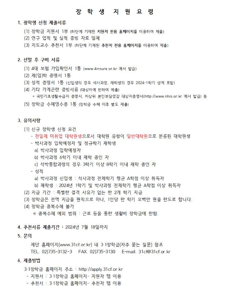 2024학년도 3·1장학금 장학생 모집 (일반 대학원)