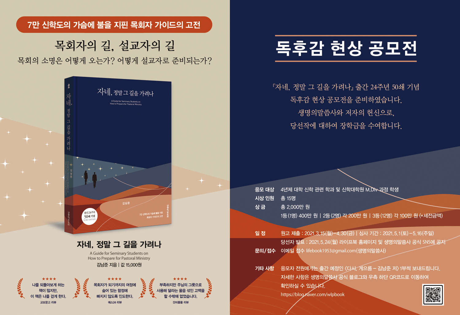열린교회 <대신대학교 섬김의 날> 도서 신청 열린교회는 신학교 섬김의 날을 통해 신학생들에게 도서를 증정합니다. 아래 내용에 맞게 신청해주시면 해당 도서를 증정해드리도록 하겠습니다. *대상: 대신대학교 학부 신학과 재학생 및 신학대학원 M.Div 재학생 *신청기간: 2021년 4월 9일(금)까지 *증정도서: 신학과(학부),M.Div 1학년 <자네, 정말 그 길을 가려나>, M.Div 2,3학년 <아무도 사랑하고 싶지 않던 밤>