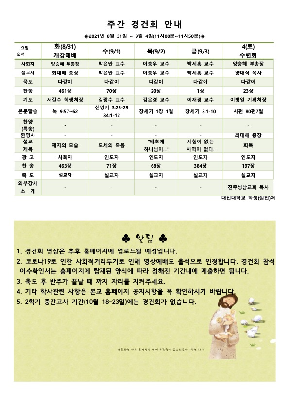 2021학년도 2학기 9월 첫째주(8/31~9/4) 경건회 안내