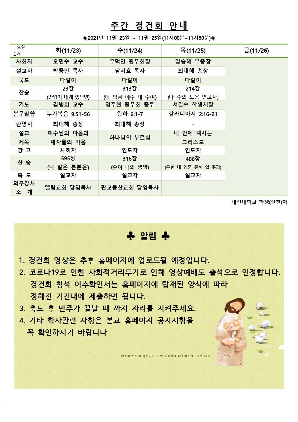 2021학년도 2학기 11월 넷째주(11/23~11/25) 경건회 안내