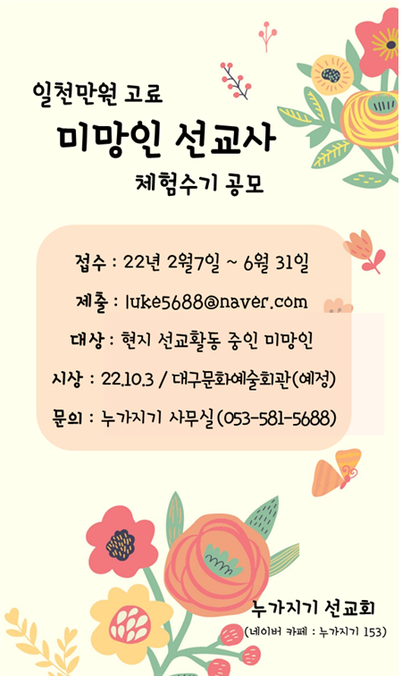 누가지기선교회에서는 선교사역 저변 확대와 활성화를 도모하고 선교사를 후원하기 위한, 1,000만원 고료 미망인 선교사 체험 수기를 공모하오니 응모하시기 바랍니다.