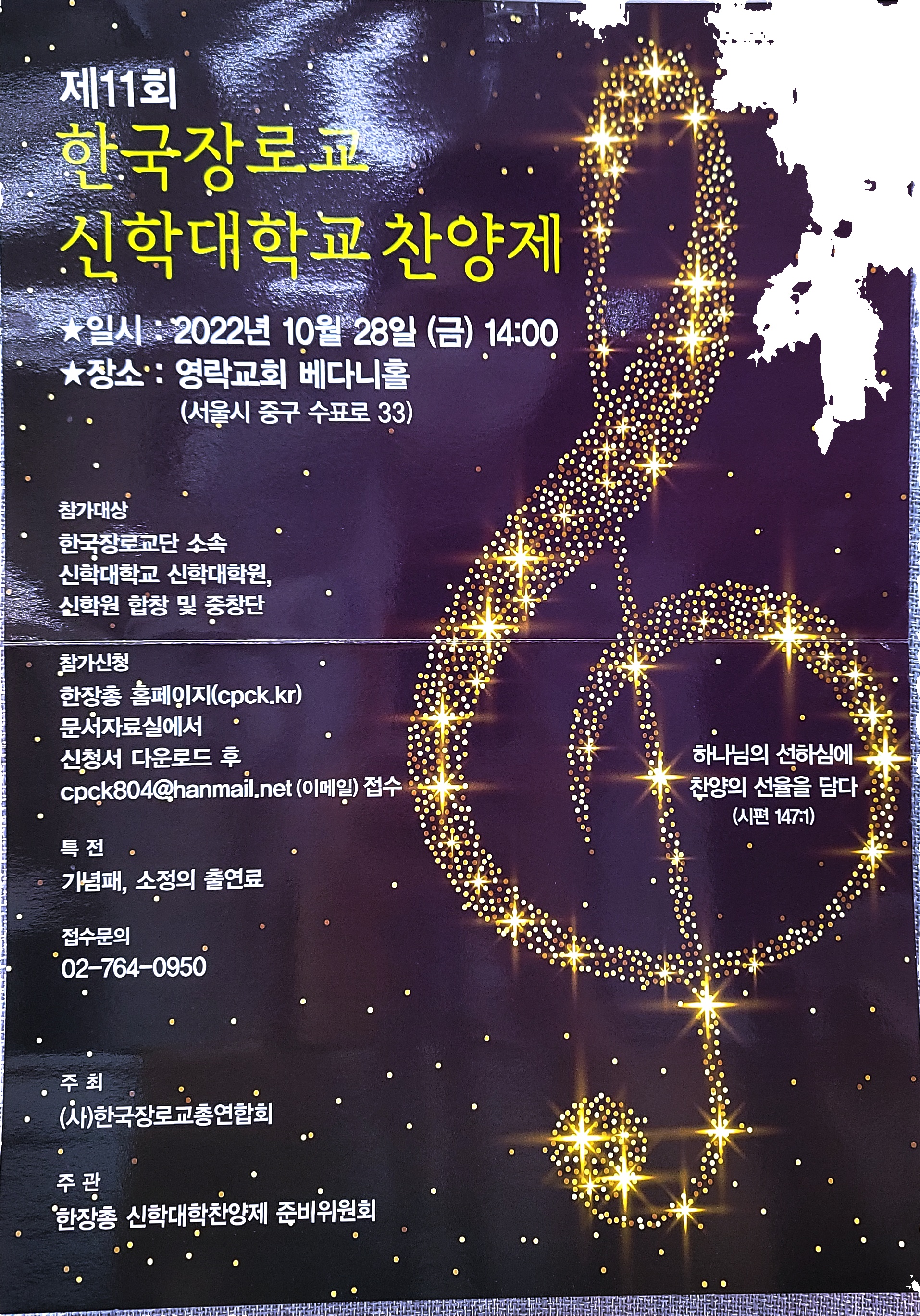 - 일시 : 2022년 10월 28일(금) 14:00~16:00 - 장소 : 영락교회 베다니홀 (서울 중구 수표로 33) - 창가대상 : 한장총 소속 교단 신학대학교, 신학대학원, 신학원생 합창 또는 중창 1팀 - 신청방법 : 한장홍 홈페이지 문서자료실(90번)에서 신청서 다운로드 후 cpck804@hanmail.net (이메일)로 접수 - 마감일 : 2022년 8월 26일(금) 16:00 까지 - 참가곡 선정 : 자유곡 1곡, 참가신청 시 제출 ※ 중복된 곡이 있을 경우 선착순 신청 팀 우선 지정 ※ 출연순서 준비위원회에서 정함 - 특전 : 기념패,소정의 출연료 - 담당자 : 천안나 행정실장 (02-764-0950) 찬양제담당실장 |