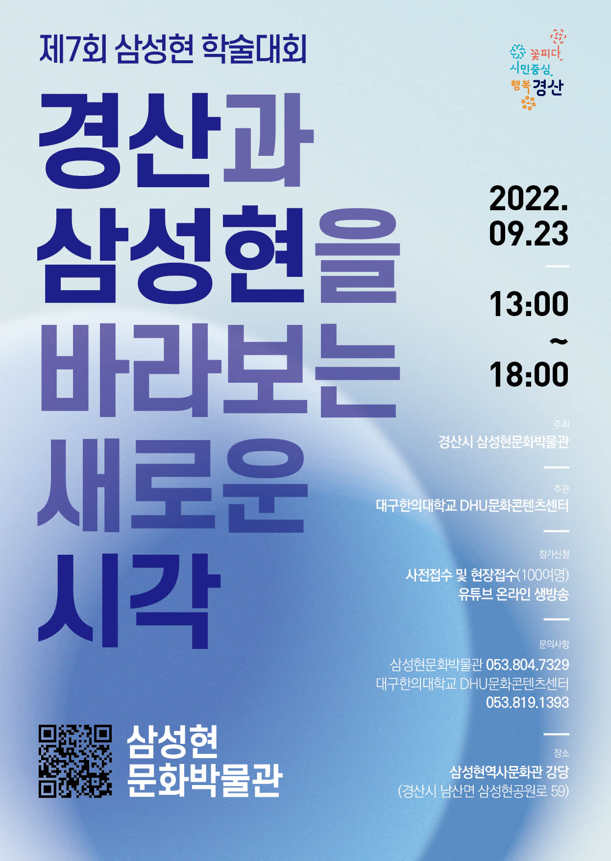● 주제: 경산과 삼성현을 바라보는 새로운 시각 ● 일시: 2022.09.23.(금), 13:00 ~ 18:00 ● 장소: 삼성현역사문화관 강당 (경북 경산시 남산면 삼성현공원로 59) ● 내용: 우리지역에서 발견된 새로운 자료를 중심으로 경산지역사와 삼성형의 업적을 새롭게 조명하고, 경산지역사로서의 삼성현 연구라는 새로운 시각을 제시하는 학술대회 ● 참석인원: 100명(사전 및 현장접수) ※ 유튜브 생방송(삼성현역사문화관 채널) ● 주최.주관: 경산시 삼성현문화박물관/ 대구한의대학교 문화콘텐츠센터 ● 문의: 삼성현문화박물관(053-804-7329) 대구한의대학교 문화콘텐츠센터(053-819-1393)