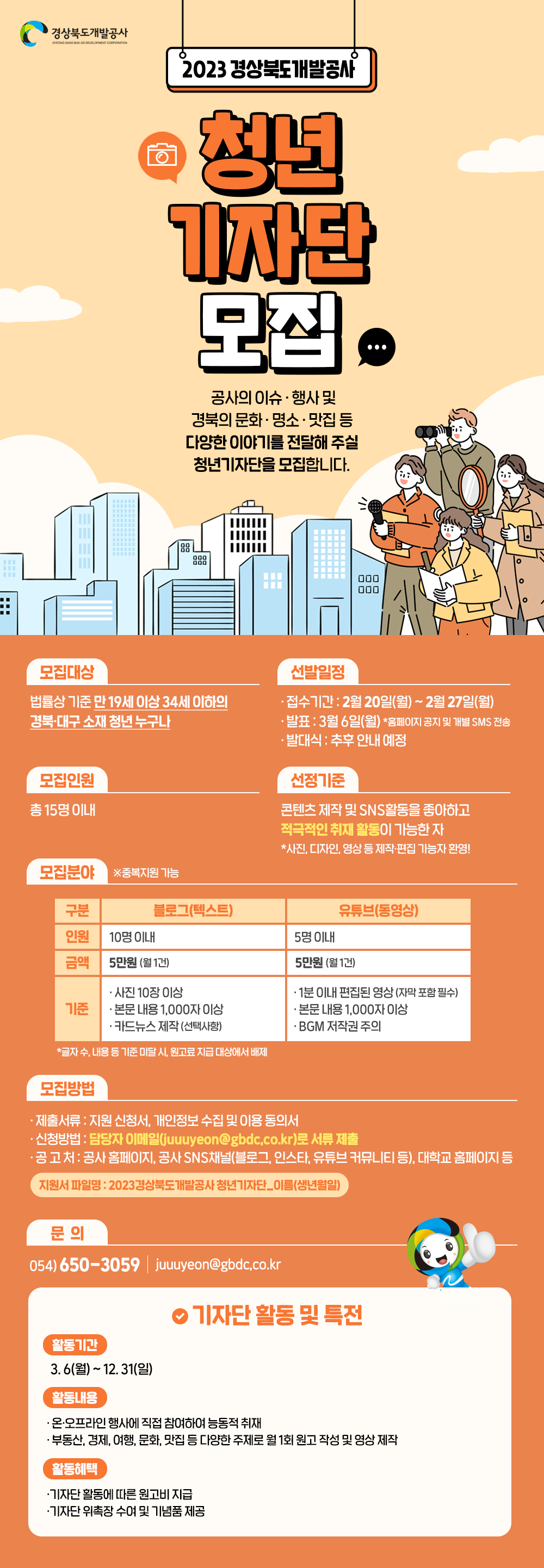 공사 관련 행사, 문화, 여행 등 다양한 이야기를 전해줄 청년기자단을 모집하고 있습니다.
