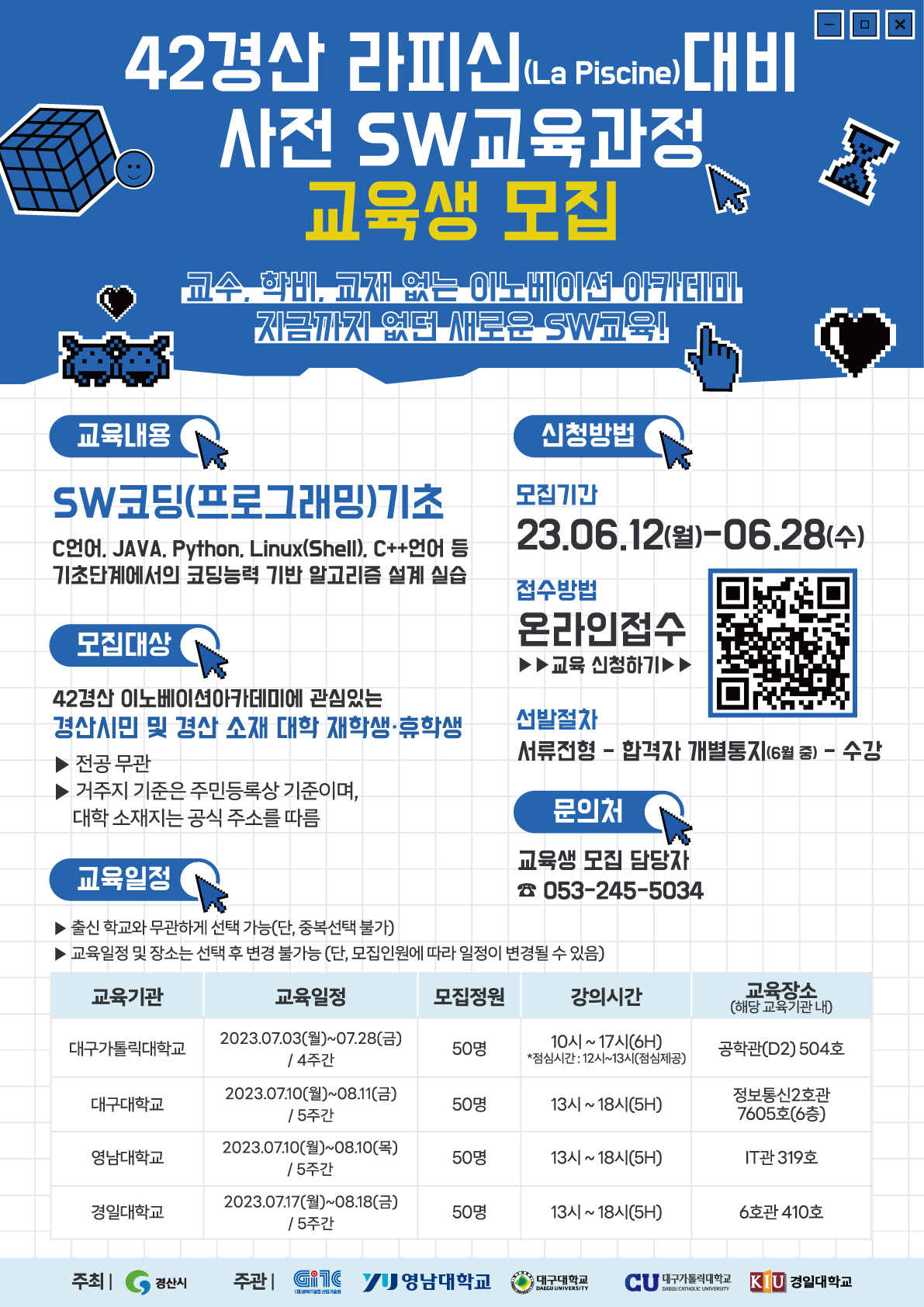 우리시에서는 42경산 이노베이션 아카데미를 유치하여 SW 교육 불균형을 해소하고 SW 인재 양성의 기반을 마련하고자 42경산 집중교육과정인 라피신 대비SW 사전 교육을 위한준비강좌를 개설하여 다음과 같이 교육생을 모집합니다.