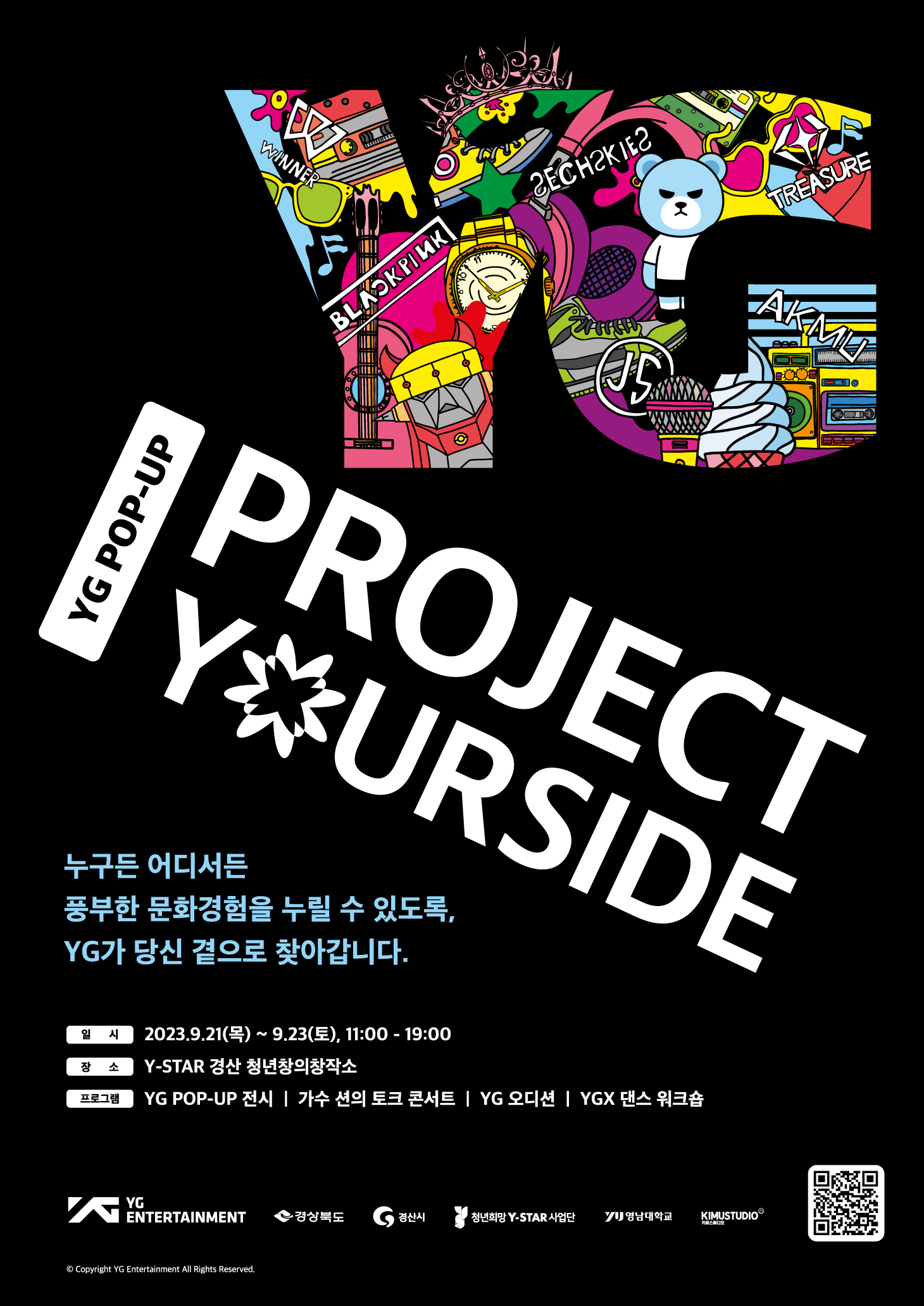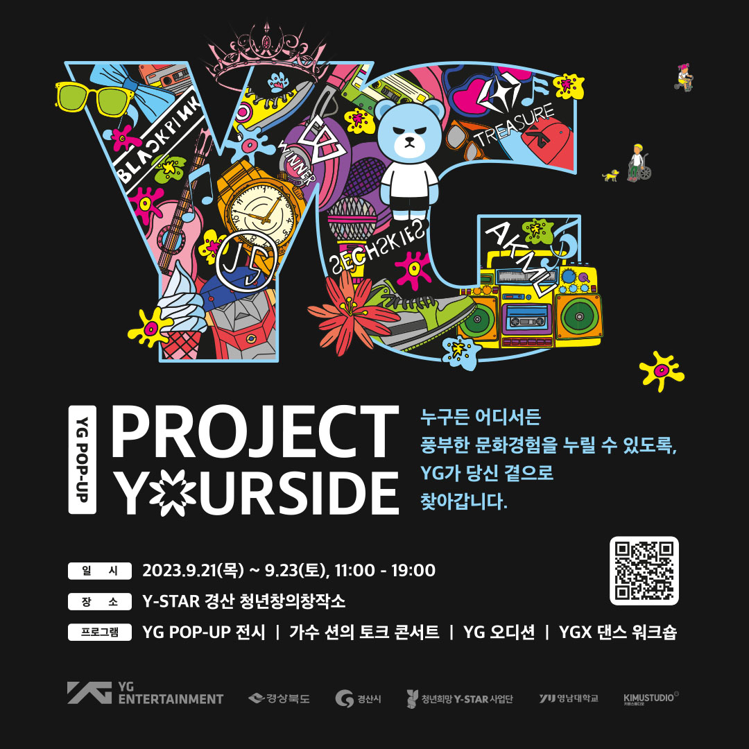 경상북도, 경산시, 영남대학교가 함께 구축한 Y-STAR 경산 청년 창의 창작소 에서 YG엔터테인먼트 POP-UP [PROJECT YOURSIDE] 행사를 진행합니다. 가. 행사명 : PORJECT YOURSIDE 나. 일시 : 2023.09.21.(목) ~ 2023. 09. 23.(토) 11:00~19:00 다. 장소 : 경북 경산시 대학로 280, Y-STAR 경산 청년 창의창작소 (건물번호 A17, 영남대학교 박물관 앞 컨테이너) 라. 프로그램 : YG POP-UP 전시, 가수 션의 토크콘서트, YG오디션, YGX댄스워크숍 |