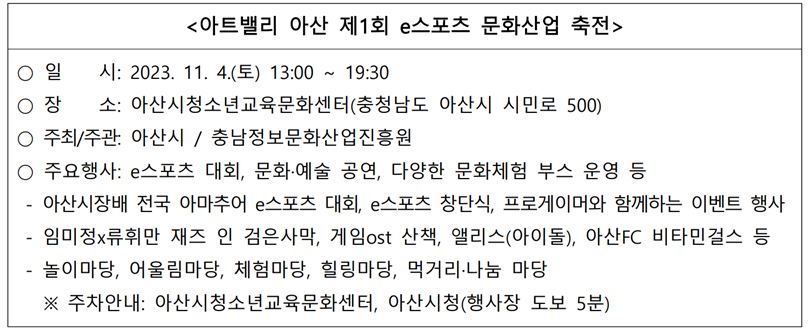 아트밸리 아산 제1회 e스포츠 문화산업 축전 개최 알림
