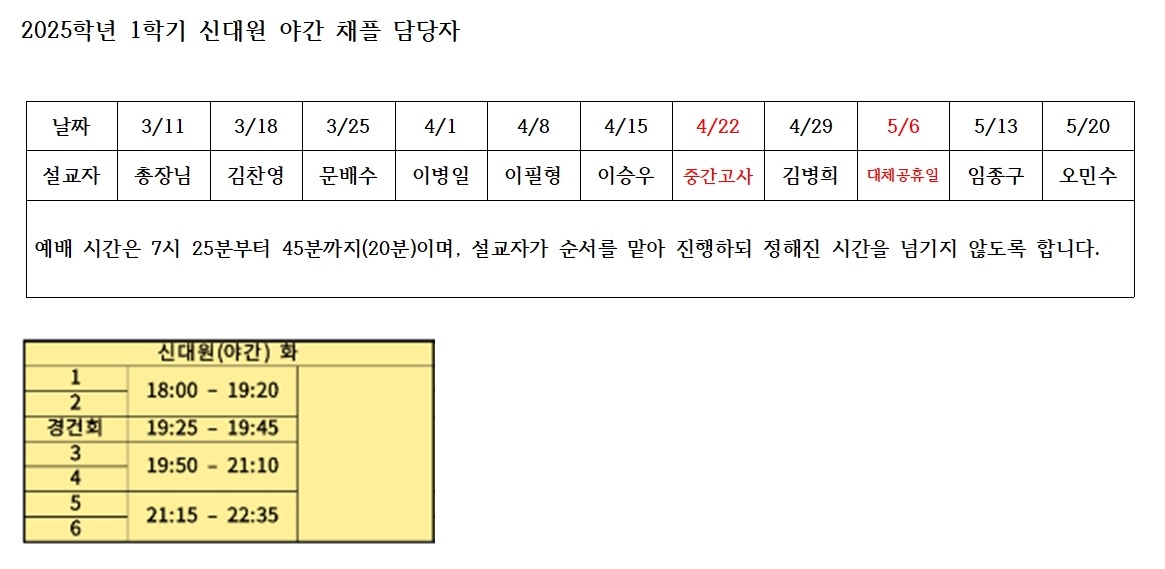 2025학년도 1학기 신대원(야간) 시간표 및 경건회 공지
