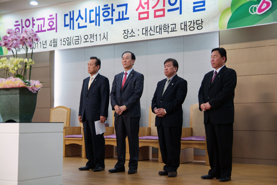 지난 4월 14일(목) 11시 본교 채플 시간에 영남지역장로회연합회(회장 권정식 장로) 실무 임원 여러분께서 함께 예배를 드렸다. 황봉환 실천처장의 “하나님을 아는 지식(호4:6)“의 설교 후 권정식장로(회장)의 ”한국 교회를 이끌어가는 위대한 대학으로 발전해 가기를 기대“한다는 권면의 말씀이 있었고 이어서 준비해 오신 장학금 300만원을 전달해 주셨다. 함께 해 주신 영남지역장로회연합회 실무임원 회장 권정식장로, 서기 정동현 장로, 회계 강신홍장로, 회록서기 박종하장로님과 장로회연합회 회원님들께 감사를 드린다. |