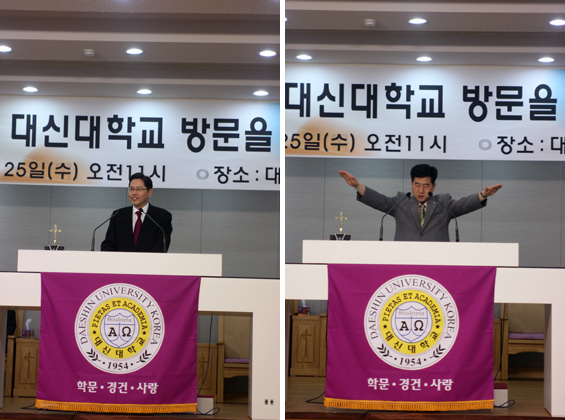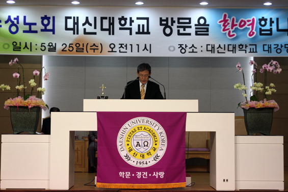 11시 본교 대강당에서 황봉한 실천처장의 사회로 수성노회 방문 감사예배가 시작되었다. 회계 남동희 장로의 기도, 부노회장 최봉우 목사(아멘교회 시무)의 설교-“어떻게 하면 의미 있는 삶을 살 수 있을까?(골1:24~29)”-와 전재규 총장의 환영사 그리고 노회 서기 고현주 목사의 축도로 예배가 드려졌다.