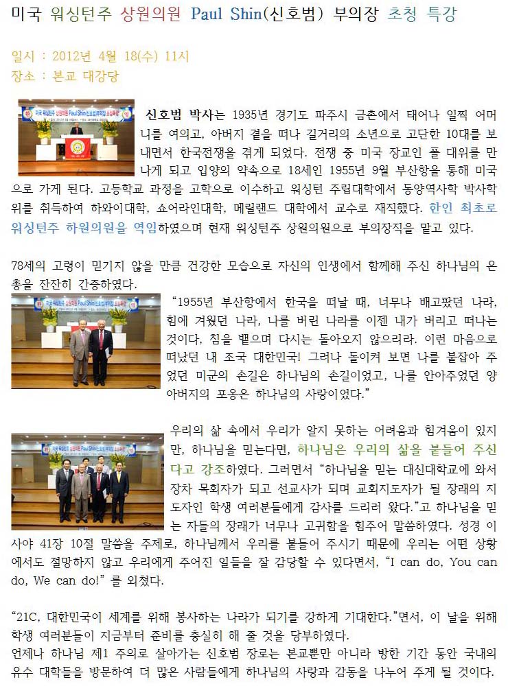 미국 워싱턴주 상원의원 Paul Shin(신호범) 부의장 초청 특강