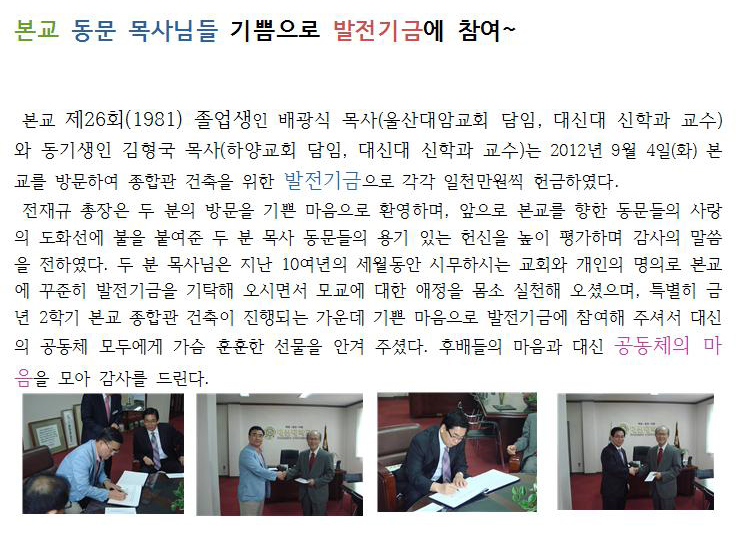 본교 동문 목사님들 기쁨으로 발전기금에 참여~