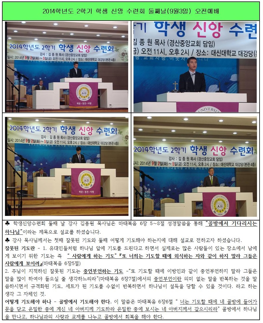 2014학년도 2학기 학생 신앙 수련회 9월 3일 오전예배