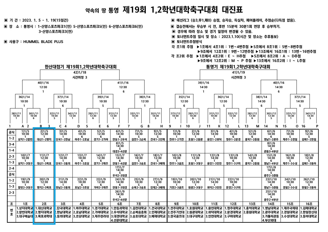 ※ 1월 9일(월)에 열린 명지대학교 vs 목포과학대학교의 경기에서 명지대학교가 1:0으로 승리하면서, 본교가 조2위(1승 1패)로 본선 16강 진출