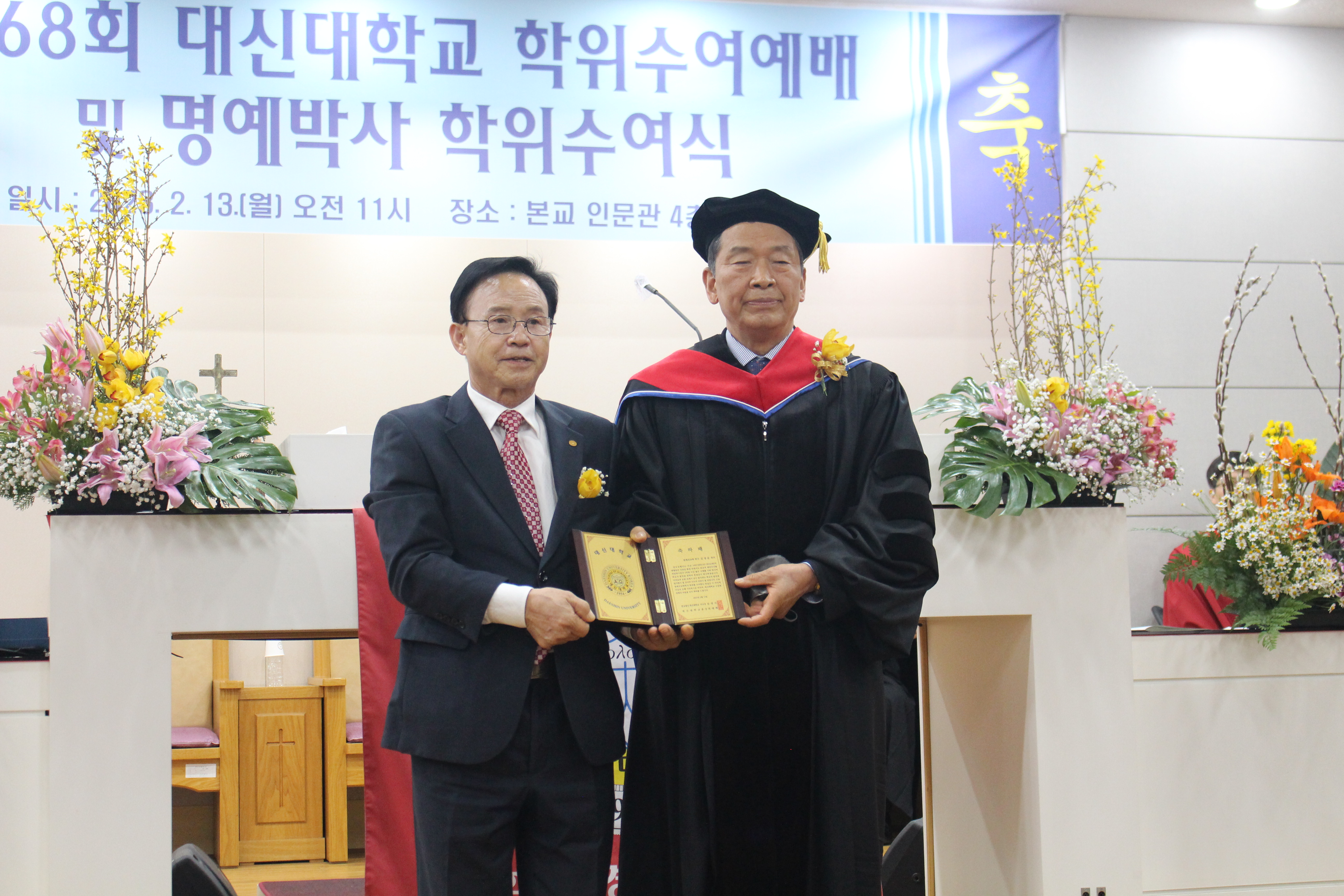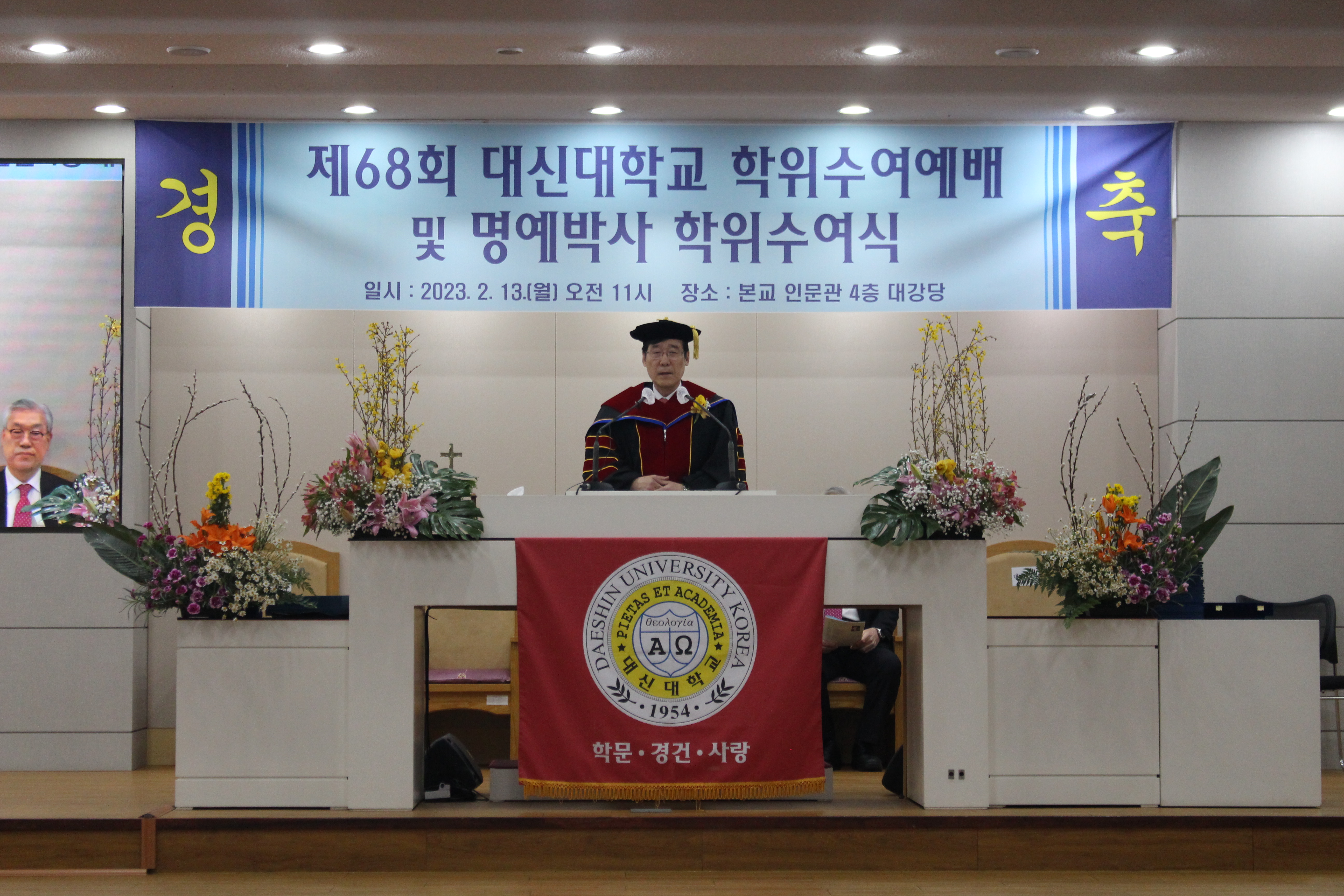 2023년 2월 13일(월) 본교 인문관 4층 대강당에서 제 68회 대신대학교, 제20회 대학원 · 신학대학원 학위수여예배및 명예박사 학위수여식이 있었다. 이날 사회는 본교 운영이사장 소재영 목사가 맡았으며, 기도에 재단이사 고성현 장로, 성경봉독에 운영부이사장 박영만 목사가 순서를 맡았고, 교회실용학부 김성빈 교수의 찬양이 있었다. 당일 총회장 권순웅 목사는 창세기 50:22-26절을 통해 "별무리 비젼"이라는 제목으로 설교하였다. 최대해 총장의 학위증서 수여와 상장 수여가 이어졌고, 총동창회장 곽양구 목사가 장학금을 전달하였다. 이날 최대해 총장이 김영운장로에게 명예선교학박사 학위수여를 하였으며, 재단이사장 임영식 장로의 축하패 증정도 있었다. 이어 김영운 명예선교학박사의 답사가 있었다. 최대해 총장의 훈사, 재단이사장 임영식 장로의 이사장치사, 명예이사장 김신길 장로와 명예이사 류재양 장로의 격려사, 재단이사 이희만 목사와 총동창회장 곽양구 목사의 축사로 졸업하는 학생들을 격려해 주었고, 재단부이사장 김재국 목사의 축도로 모든 순서를 마쳤다. 학위수여를 받은 학생은 문학사(B.A.) 72명, 음악학사(B.Mus) 19명, 철학박사(Ph.D.) 2명, 신학석사(Th.M.) 3명, 문학석사(M.A.) 1명, 음악석사(M.Mus.) 1명, 목회학석사(M.Div.) 42명, 목회학석사 연구과정(M.Div.eq.) 10명, 목회신학원 4명, 명예선교학박사(H.D.Miss.) 1명으로 총 155명이었다. 코로나 이후 맞게 된 이날 졸업식은 인문관 강당을 가득 채운 축하객들로 인해 풍성한 축제의 날이였다.