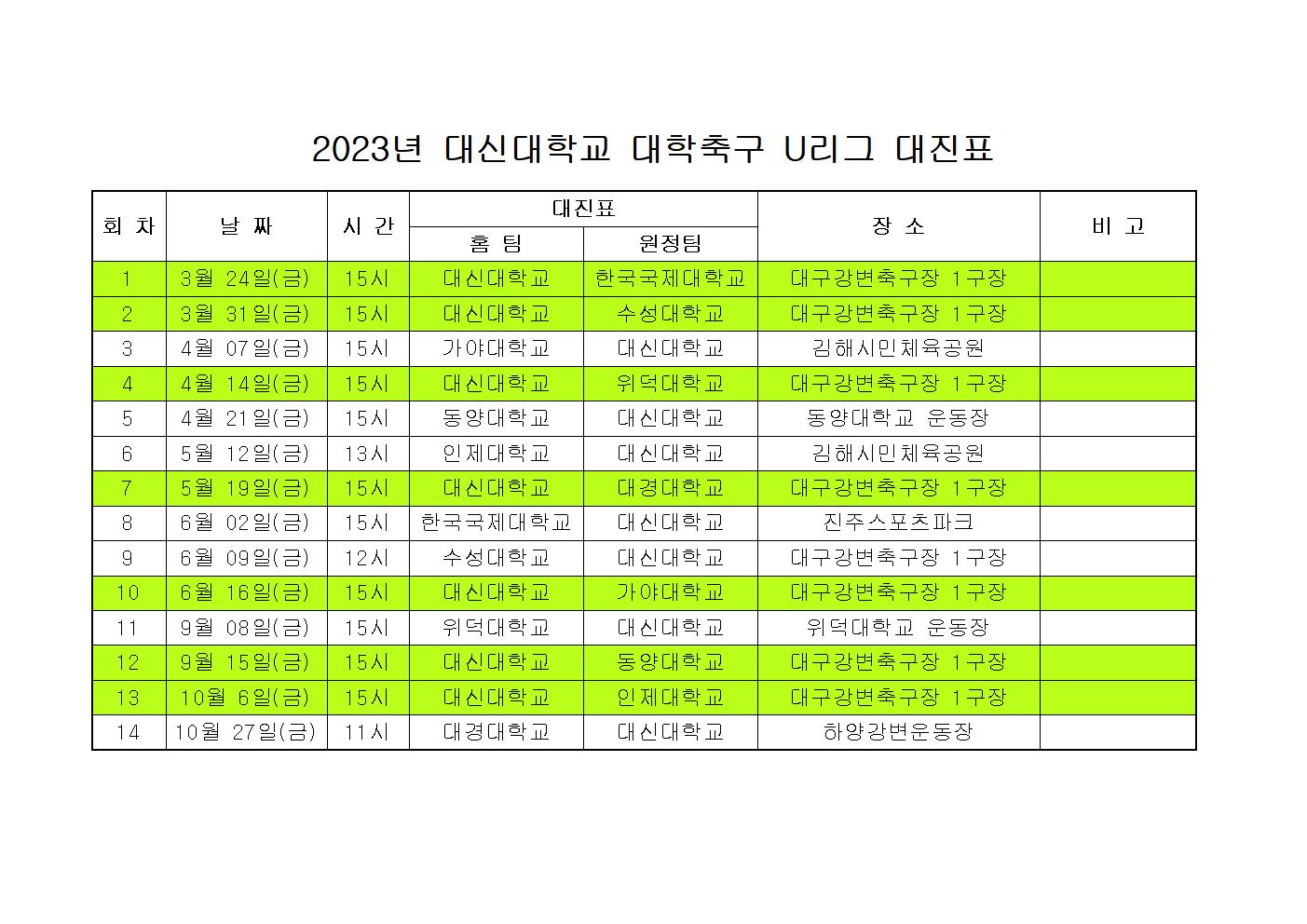 2023년 대신대학교 대학축구 U리그 대진표 회 차 | 날 짜 | 시 간 | 대진표 | 장 소 | 비 고 | 홈 팀 | 원정팀 | 1 | 3월 24일(금) | 15시 | 대신대학교 | 한국국제대학교 | 대구강변축구장 1구장 | | 2 | 3월 31일(금) | 15시 | 대신대학교 | 수성대학교 | 대구강변축구장 1구장 | | 3 | 4월 07일(금) | 15시 | 가야대학교 | 대신대학교 | 김해시민체육공원 | | 4 | 4월 14일(금) | 15시 | 대신대학교 | 위덕대학교 | 대구강변축구장 1구장 | | 5 | 4월 21일(금) | 15시 | 동양대학교 | 대신대학교 | 동양대학교 운동장 | | 6 | 5월 12일(금) | 13시 | 인제대학교 | 대신대학교 | 김해시민체육공원 | | 7 | 5월 19일(금) | 15시 | 대신대학교 | 대경대학교 | 대구강변축구장 1구장 | | 8 | 6월 02일(금) | 15시 | 한국국제대학교 | 대신대학교 | 진주스포츠파크 | | 9 | 6월 09일(금) | 12시 | 수성대학교 | 대신대학교 | 대구강변축구장 1구장 | | 10 | 6월 16일(금) | 15시 | 대신대학교 | 가야대학교 | 대구강변축구장 1구장 | | 11 | 9월 08일(금) | 15시 | 위덕대학교 | 대신대학교 | 위덕대학교 운동장 | | 12 | 9월 15일(금) | 15시 | 대신대학교 | 동양대학교 | 대구강변축구장 1구장 | | 13 | 10월 6일(금) | 15시 | 대신대학교 | 인제대학교 | 대구강변축구장 1구장 | | 14 | 10월 27일(금) | 11시 | 대경대학교 | 대신대학교 | 하양강변운동장 | |