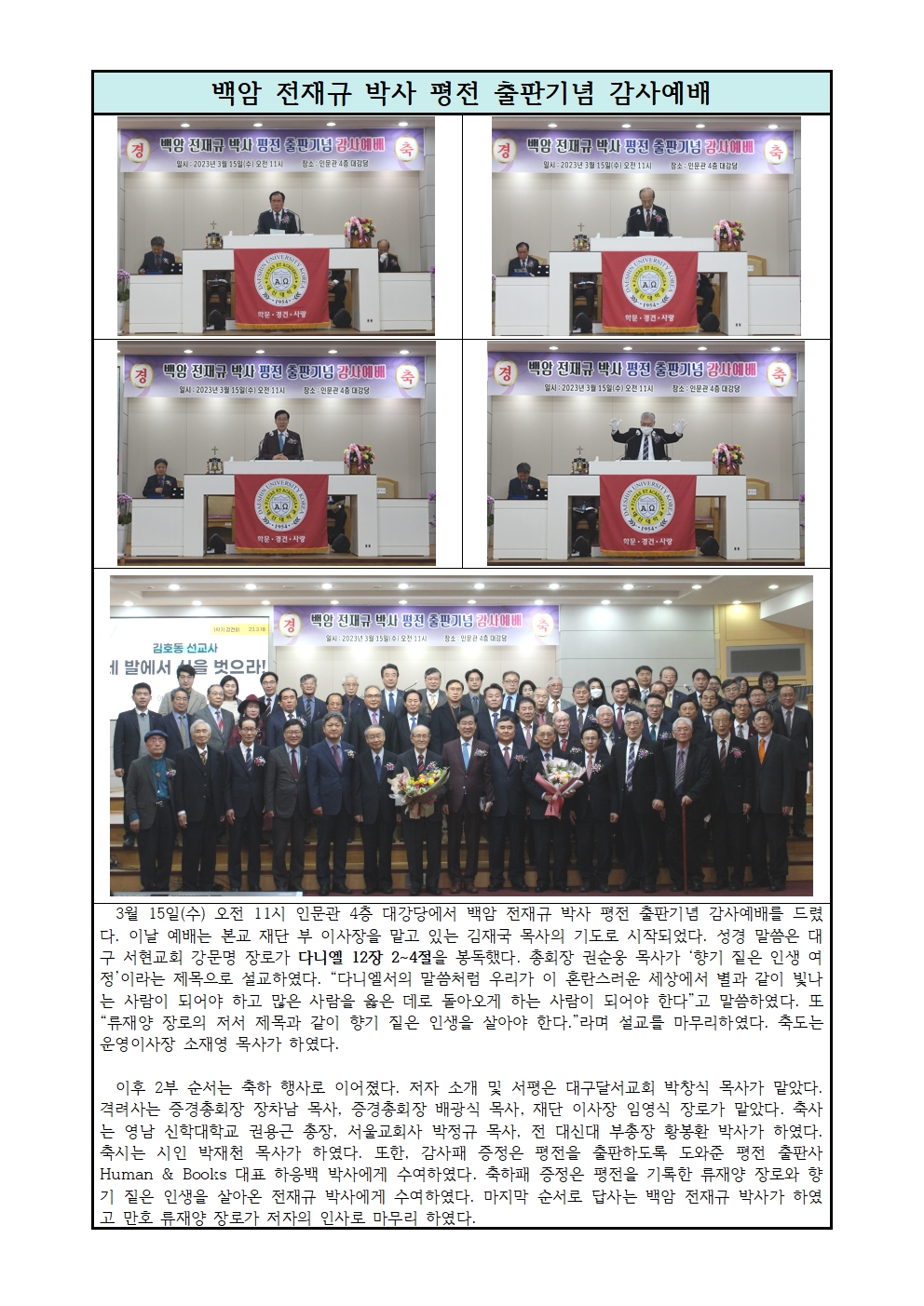 3월 15일 수요일 대신대학교 명예총장 백암 전재규 박사 평전 출판기념 감사예배