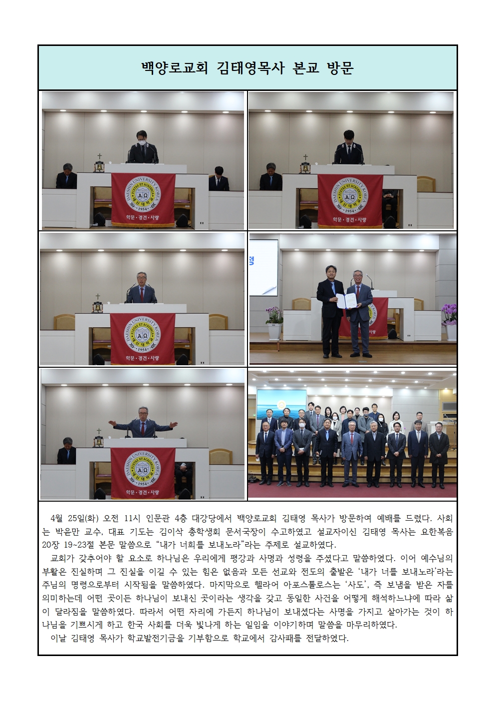 영천제일교회 민광 원로목사 본교방문 (4. 26. 목.)