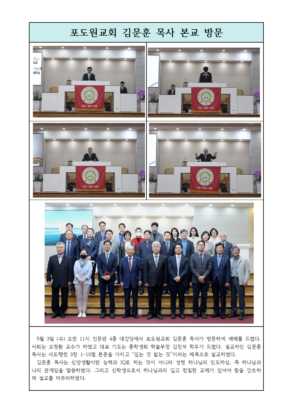 포도원교회 김문훈 목사 본교 방문