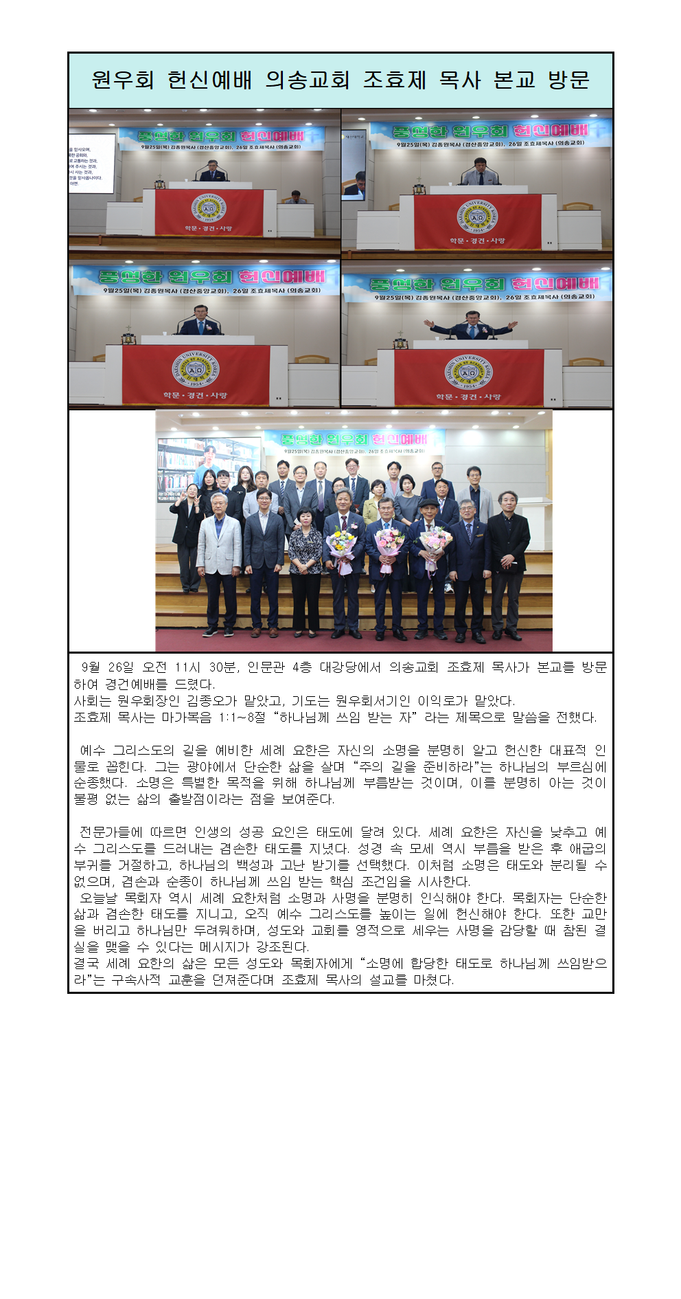원우회 헌신예배 의송교회 조효제 목사 본교 방문