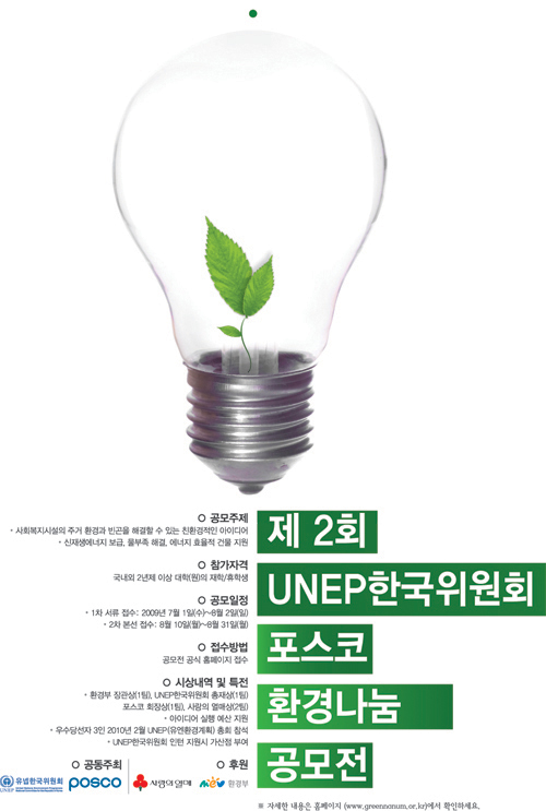 2) 내용 : 본 공모전은 사회소외계층의 복지 및 교육을 담당하는 기관 및 시설에서 환경문제와 빈곤을 해결할 수 있는 실천적인 아이디어를 대학(원)생들이 제안하고, 당선된 아이디어를 직접 시행할 수 있도록 지원합니다. 또한 대학(원)생 우수 당선자 3인에게 2010년 2월에 열리는 UNEP 총회에 참석하는 기회를 주어 미래 주역들의 글로벌 에코리더십을 발굴합니다.
