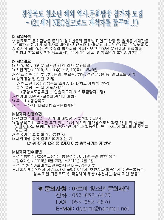 ▷ 사업개요 1) 사 업 명 : 어려운 청소년 해외 역사 문화탐방 2) 사업기간 : 2010. 8. 11(수) ~ 8. 19(목) - 8박9일 3) 장 소 : 중국(우루무치, 돈황, 투르판, 하밀, 선선, 유원 등) 실크로드 지역 4) 참가대상 및 인원: 21명 ▷ 청소년 16명(경상북도 소재지 내 대학교 재학생 선발) ▷ 인솔공무원 및 지도자 5명 (경상북도공무원 1, 인솔지도자 3명, 의무담당자 1명) 5) 참가비:30만원 (교통비,숙식비 포함) 6) 주 최: 경상북도 7) 주 관: (재) 아르미청소년문화재단