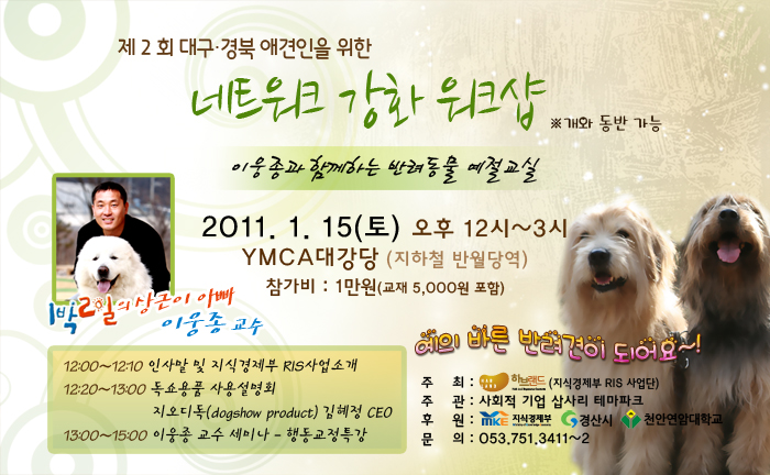 ○ 주 제 : 이웅종과 함께하는 반려동물예절교실 ○ 주 최 : (주)하브랜드 (지식경제부 RIS 사업단)- 053.751.3412 ○ 주 관 : 사회적 기업 삽사리 테마파크 ○ 기 간 : 2010. 1. 15(토) 12시∼15시 ○ 장 소 : YMCA 대강당 ○ 후 원 : 지식경제부, 경산시 ○ 참 가 비 : 10,000원 (교재비포함) |