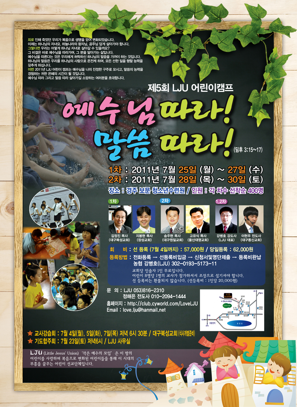 샬롬~^^저는 LJU 홍보 팀장 이종원 전도사입니다. 저히 LJU에서는 2011년 여름캠프를 함께 스탭으로 함께 섬겨주실 분을 모집합니다. 다음세대의 관심이나 비전이 있으신 분들께서는 스탭으로 섬겨주시면서 배움의 장이 될 수도 있을 듯합니다. 문의 010-9011-1904(홍보팀장), 사무실 053-816-2310 전화 주시면 자세한 사항을 알려드리겠습니다. |