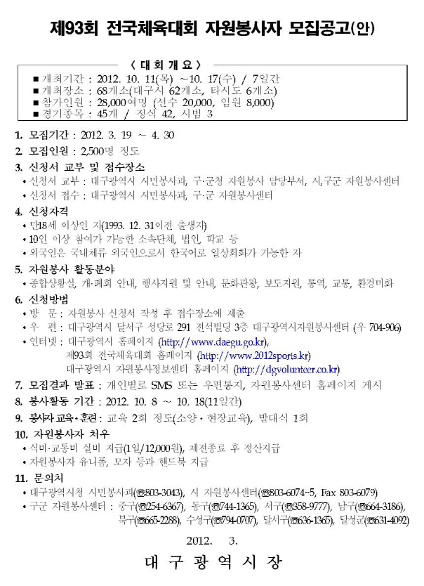 2012전국체전자원봉사자모집및운영계획모집공고문