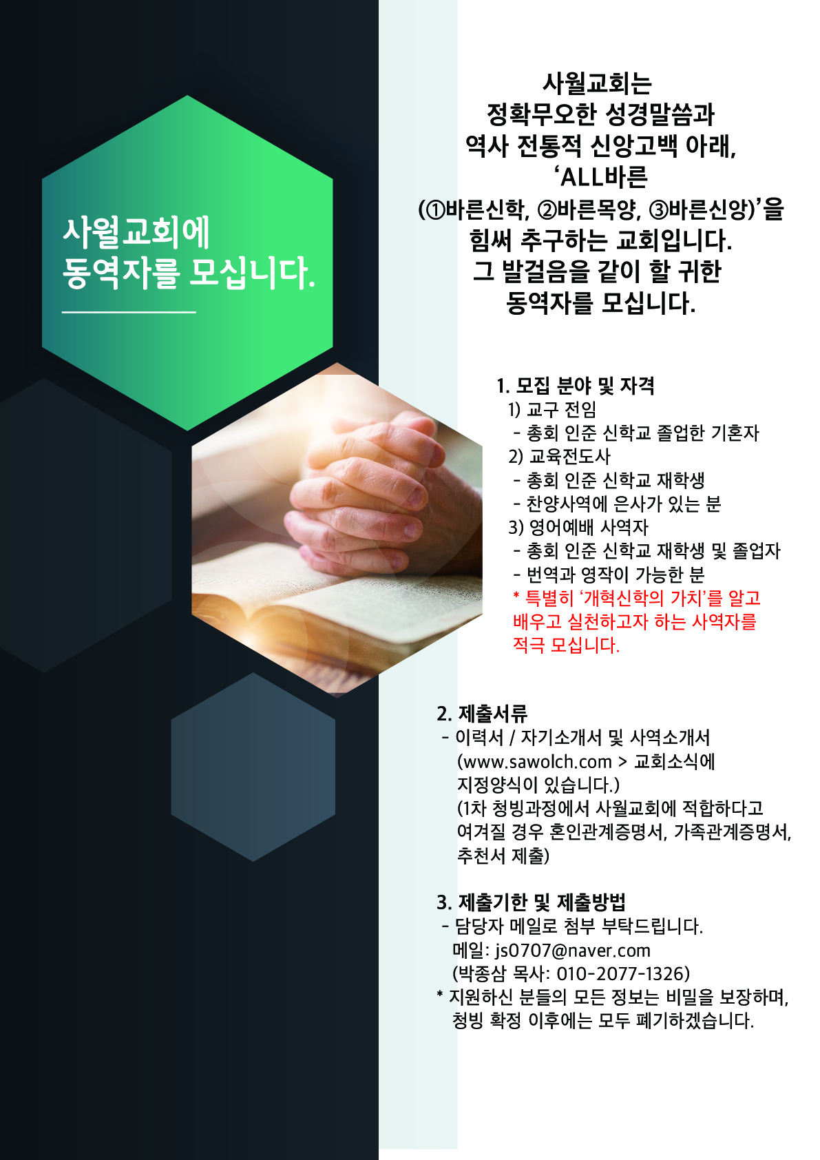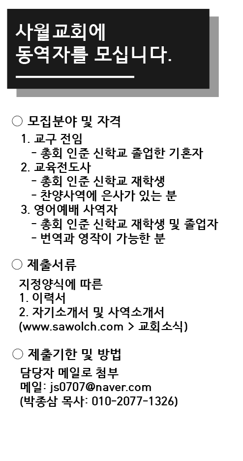 | 사월교회에서 동역자를 모십니다. | |||||||||