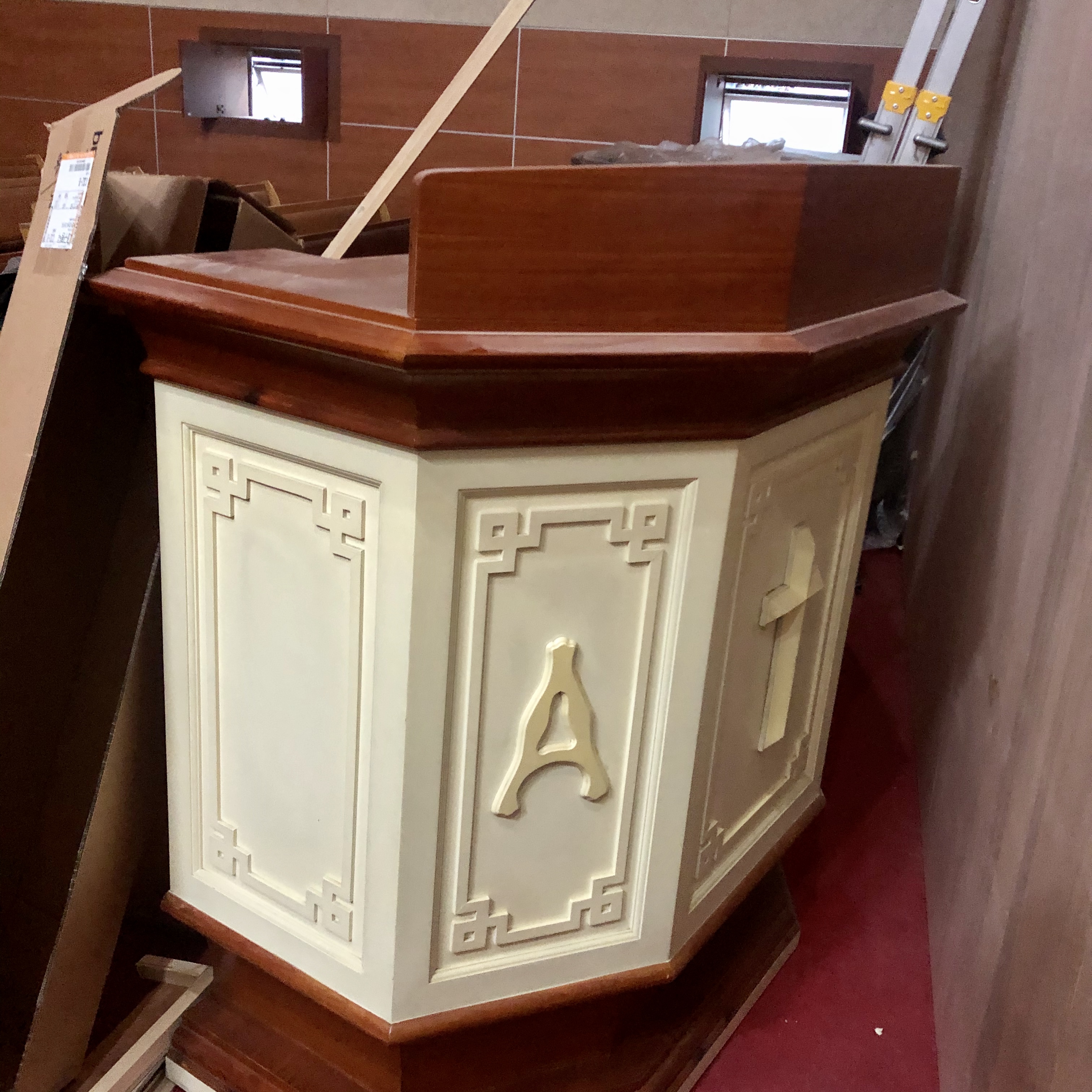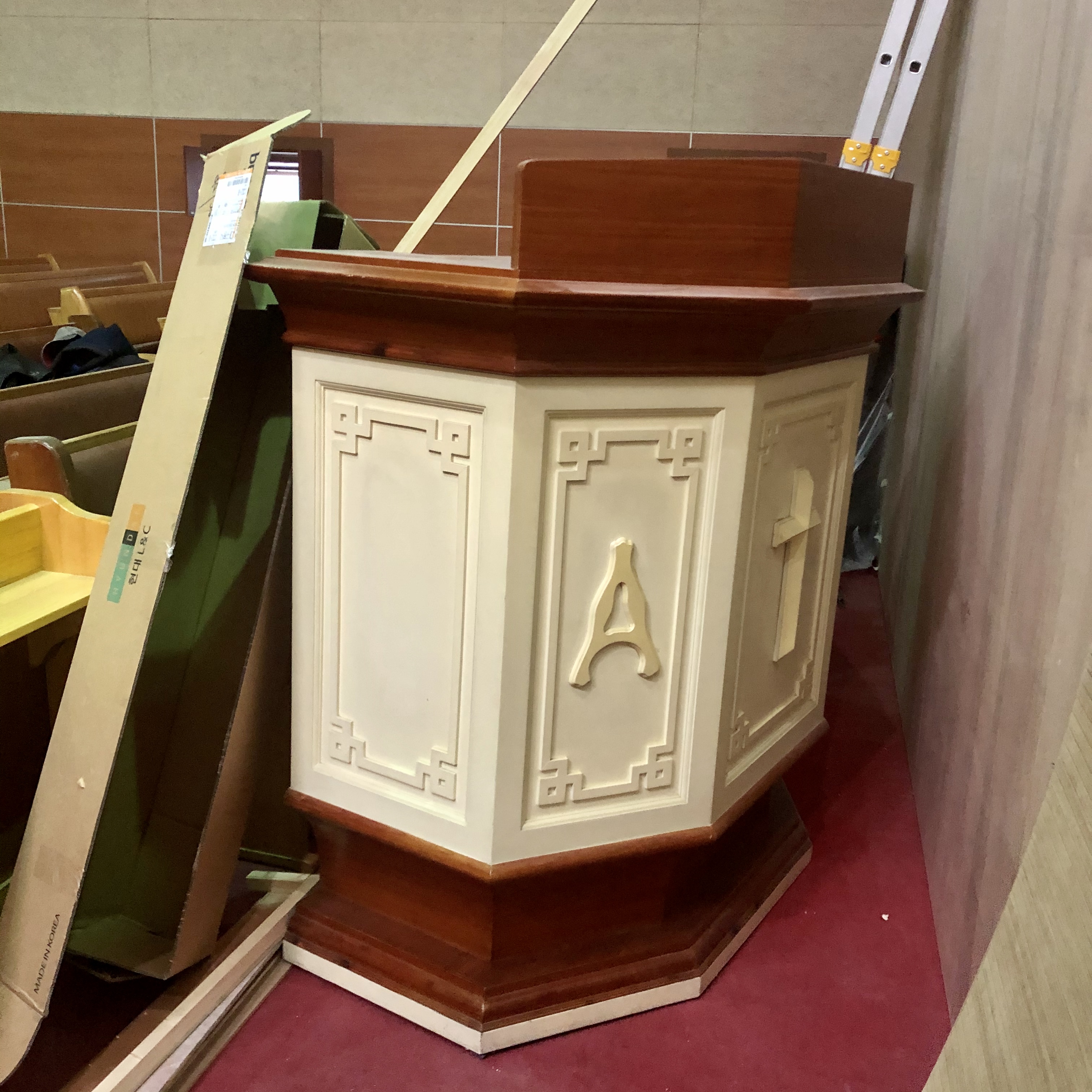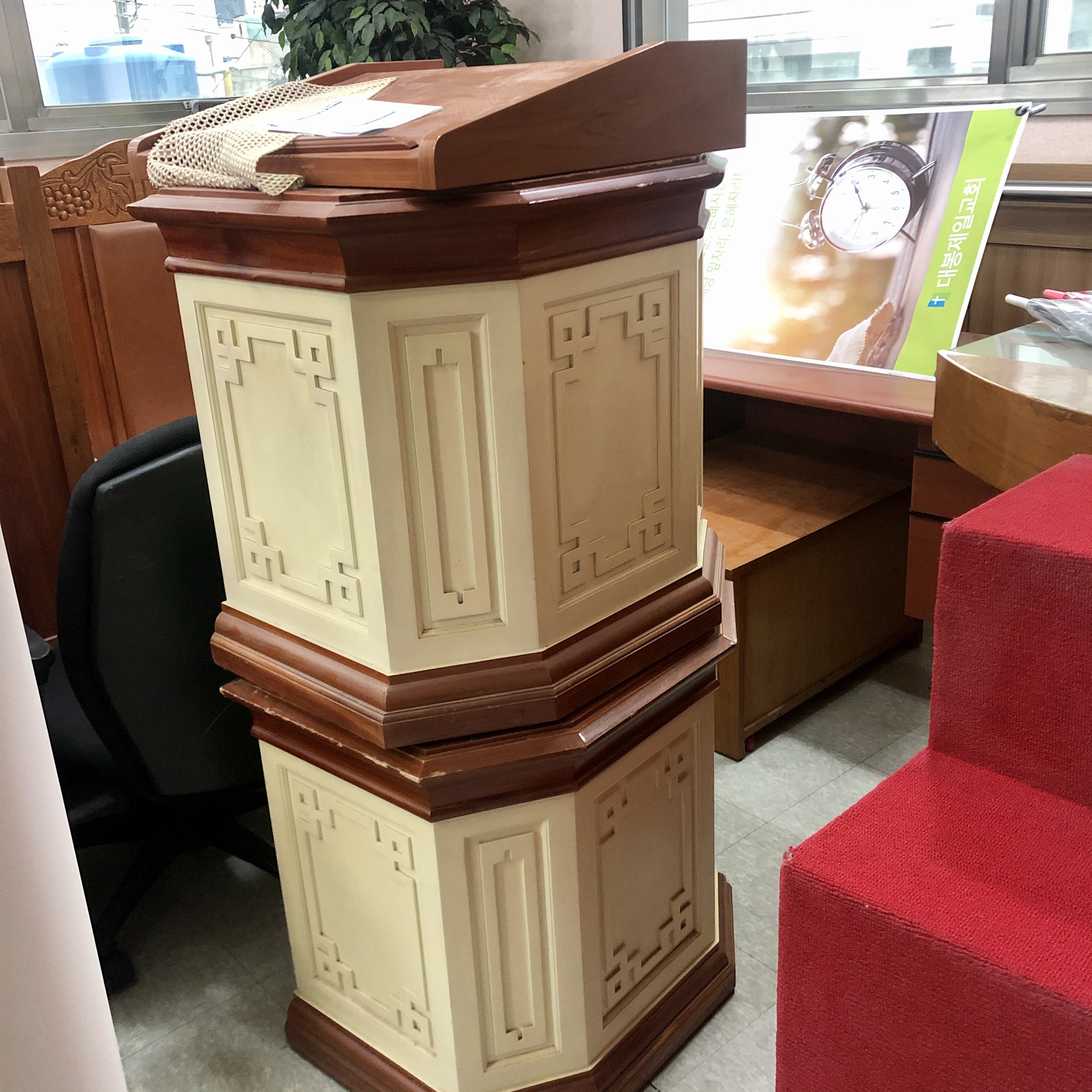 이번에 예배실 전면을 리모델링을 하며 기존에 사용하던 강대상을 교체하게 되었습니다. 필요하신 교회나 개인으로 연락주시면 드리겠습니다. (단, 배송은 하지 않습니다. 가지고 가셔야 됩니다.) 강대상 1개와 양쪽 꽃 받침대?? 2개 입니다. 장소 : 대봉제일교회 주소 : 대구 남구 대봉로 116-64 전화번호 : 053) 476-3511