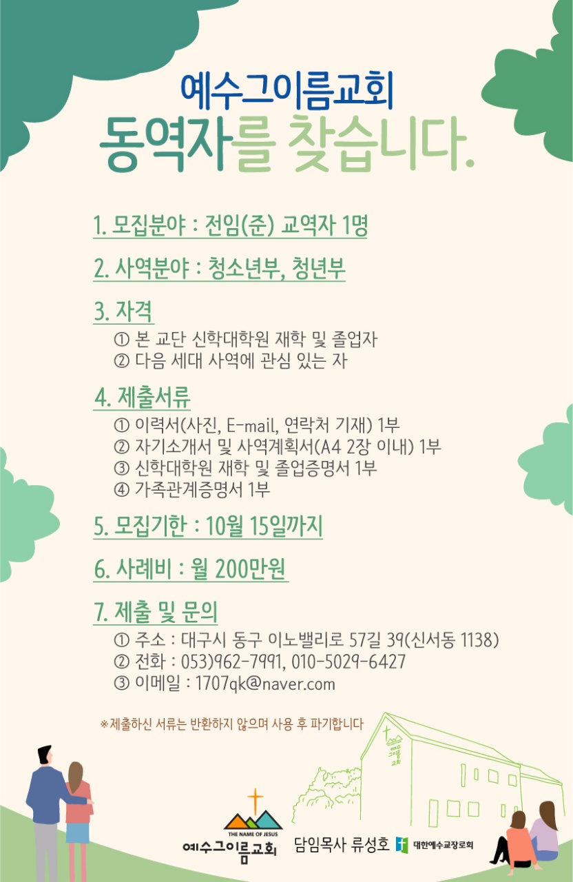 대구동성교회에서 선교사후보생으로 부교역자(전임부목사와 강도사)사역할 분 또는 교육목사와 교육전도사(영유치부)&사무간사(여)를 모십니다.
