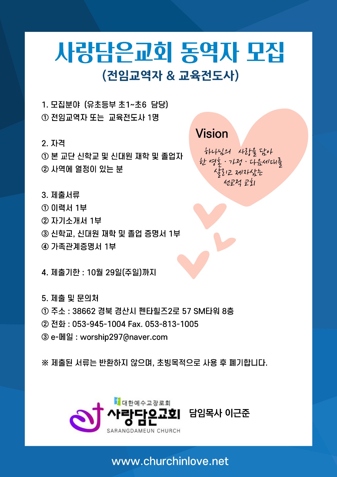 사랑담은교회 교육전도사&전임교역자 모집합니다