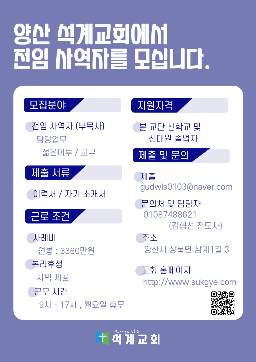 양산 석계교회에서 전임 사역자를 모십니다.