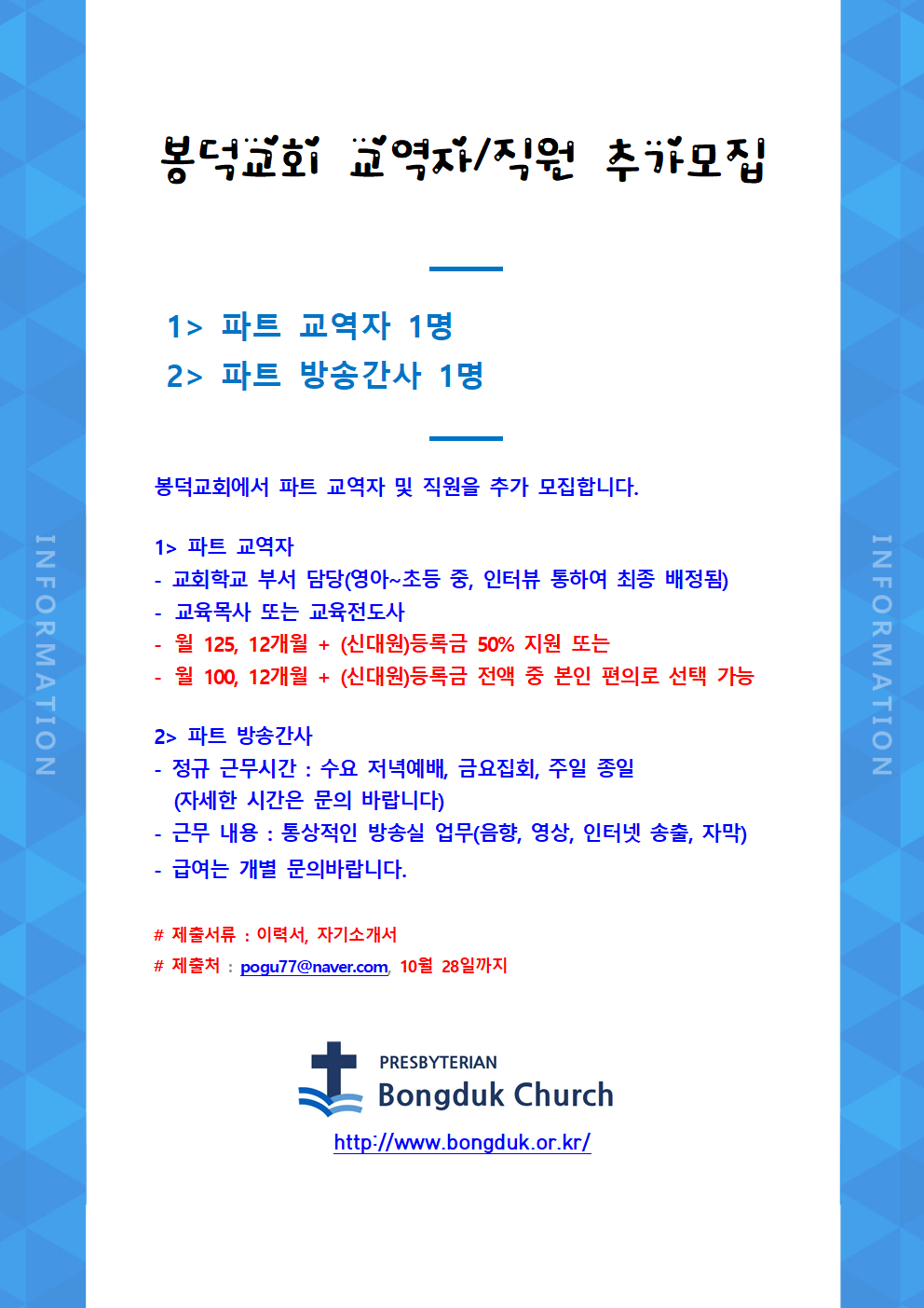 대구 대봉제일교회에서 함께 사역할 동역자(교육목사, 교육전도사)를 아래와 같이 청빙합니다.