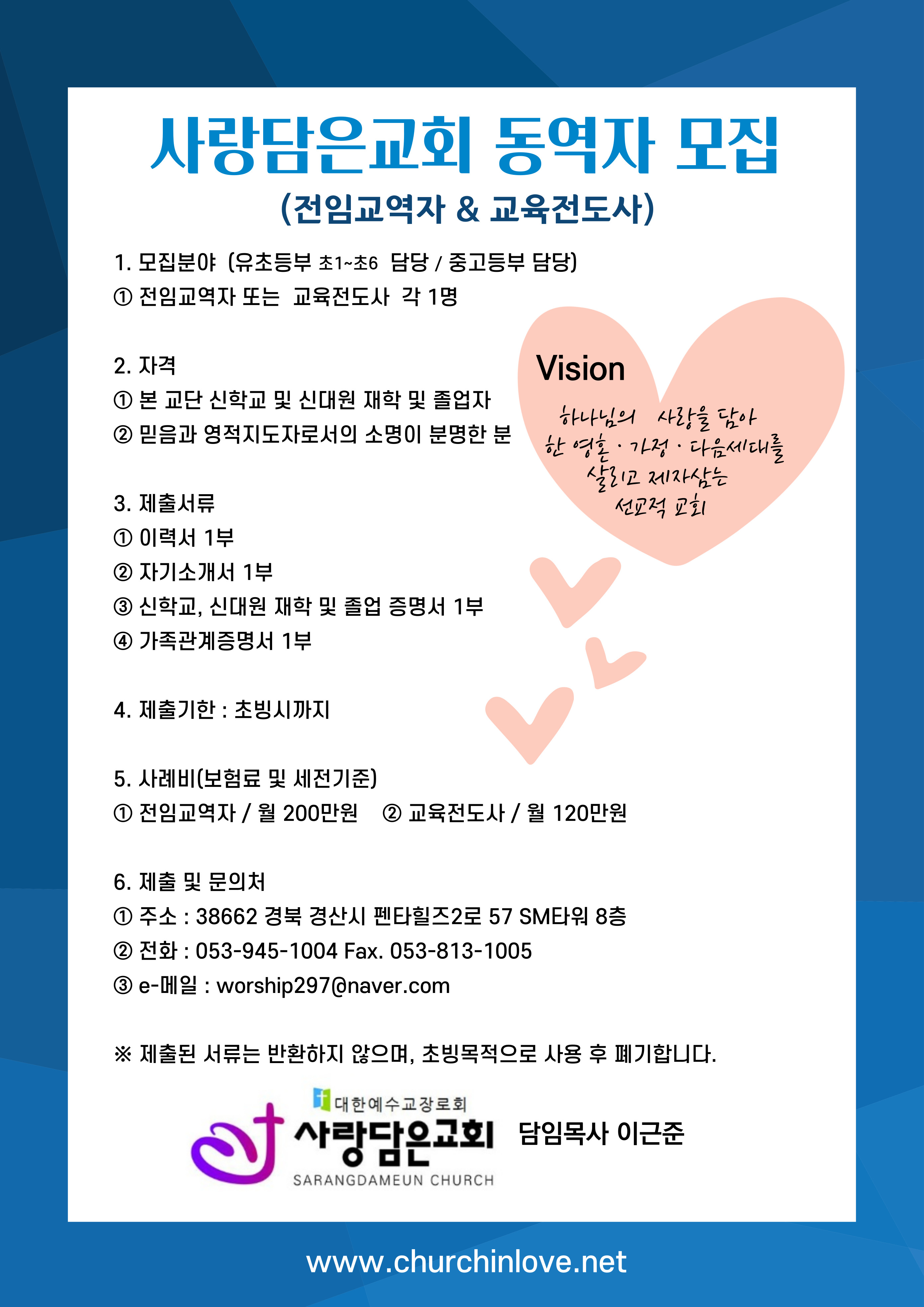 (끌어올림) 사랑담은교회 전임교역자&교육전도사 모집합니다