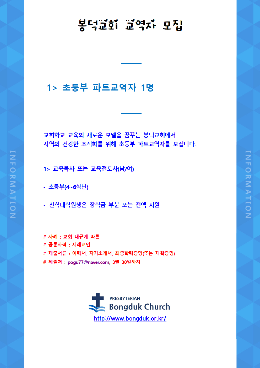 대구 봉덕교회 초등부 파트교역자 모집