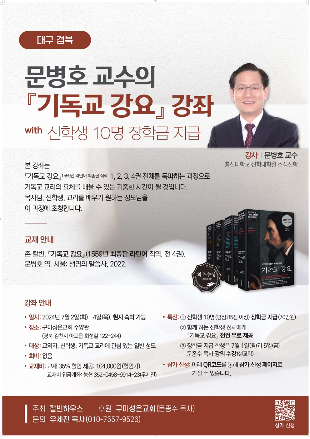"대구, 경북 지역에서 처음으로 [라틴어 직역, 전4권] 기독교강요 강좌를 개최하게 되었습니다. 목회자, 신학생, 교리에 관심 있는 성도들의 많은 참여를 기다리겠습니다." [신학생에게는 '전4권' 무상 제공합니다]. 세부 내용 및 강의 시간표는 첨부파일을 참조해 주세요. *문의: 010-7557-9526(우세진 목사)