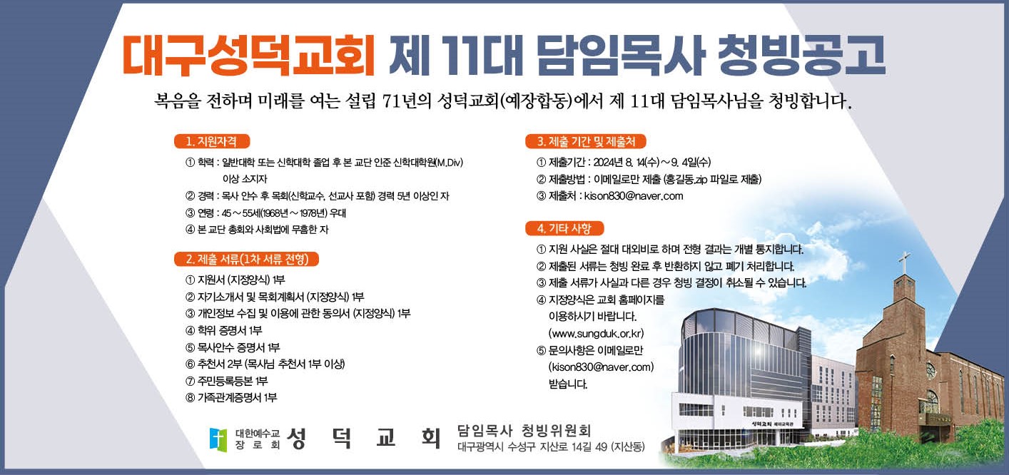 대구성덕교회 제 11대 담임목사 청빙공고 설립 71년의 성덕교회(예장합동)에서 제 11대 담임목사님을 청빙합니다. 1. 지원 자격 ① 학력 : 일반대학 또는 신학대학 졸업 후 본 교단 인준 신학대학원(M.Div)) 이상 소지자 ② 경력 : 목사 안수 후 목회(신학교수, 선교사 포함) 경력 5년 이상인 자 ③ 연령 : 45~55세(1968년~1978년) 우대 ④ 본 교단 총회와 사회법에 무흠한 자 2. 제출 서류(1차 서류 전형) ① 지원서 (지정양식) 1부 ② 자기소개서 및 목회계획서 (지정양식) 1부 ③ 개인정보 수집 및 이용에 관한 동의서 (지정양식) 1부 ④ 학위 증명서 1부 ⑤ 목사안수 증명서 1부 ⑥ 추천서 2부 (목사님 추천서 1부 이상) ⑦ 주민등록등본 1부 ⑧ 가족관계증명서 1부 3. 제출 기간 및 제출처 ① 제출기간 : 2024년 8.14(수)~9.4일(수) ② 제출방법 : 이메일로만 제출 (홍길동.zip 파일로 제출) ③ 제출처 : kison830@naver.com 4. 기타 사항 ① 지원 사실은 절대 대외비로 하며 전형 결과는 개별 통지합니다. ② 제출된 서류는 청빙 완료 후 반환하지 않고 폐기 처리합니다. ③ 제출 서류가 사실과 다른 경우 청빙 결정이 취소될 수 있습니다. ④ 지정양식은 교회 홈페이지를 이용하시기 바랍니다. ( www.sungduk.or.kr ) ⑤ 문의사항은 이메일( kison830@naver.com )로만 받습니다. 대한예수교장로회 성덕교회 담임목사청빙위원회 대구광역시 수성구 지산로 14길 49 (지산동) |