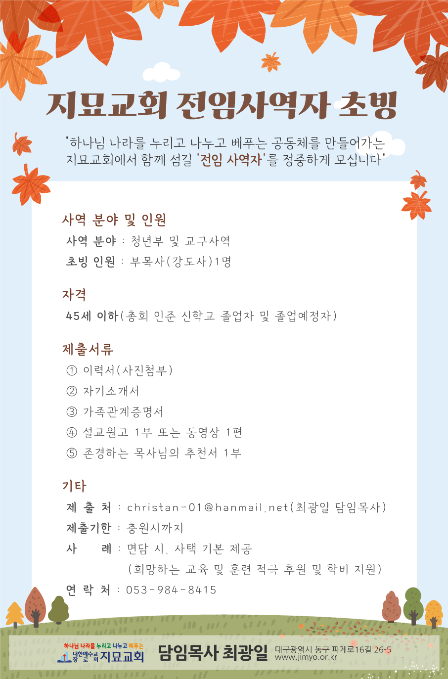 대구동성교회에서 함께 동역하실 전임사역자(부목사, 여전도사) 및 사무간사를 모십니다.