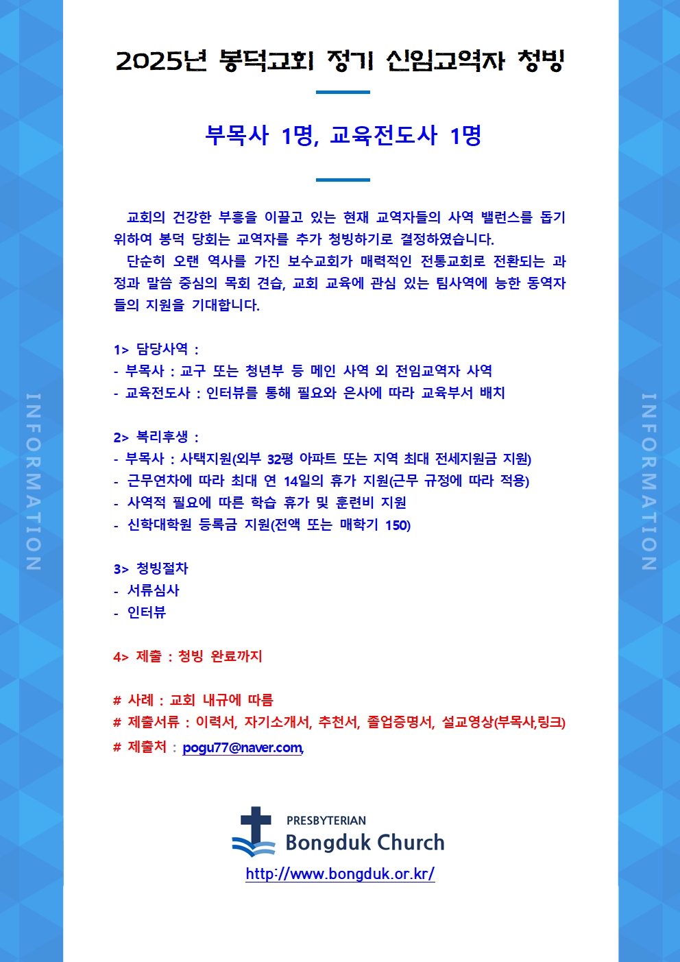 봉덕교회 2025년을 위한 정기 신임교역자 선발 공고