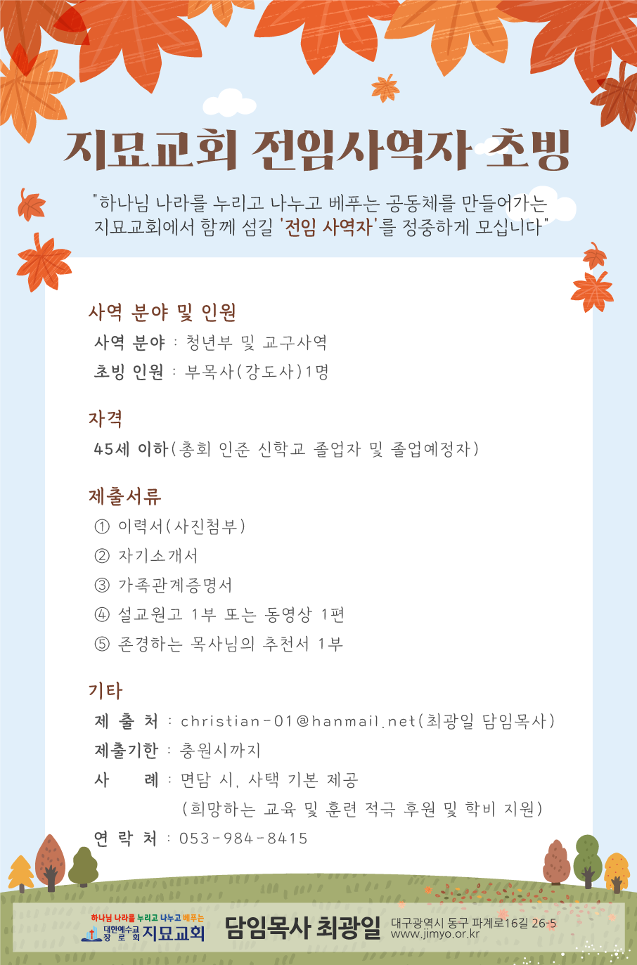 (메일 오타 수정) 지묘교회에서 전임사역자를 초빙합니다.