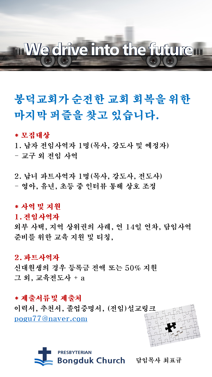 김천부곡교회에서 함께 동역할 파트 사역자(교육목사, 남,여전도사)를 모십니다.